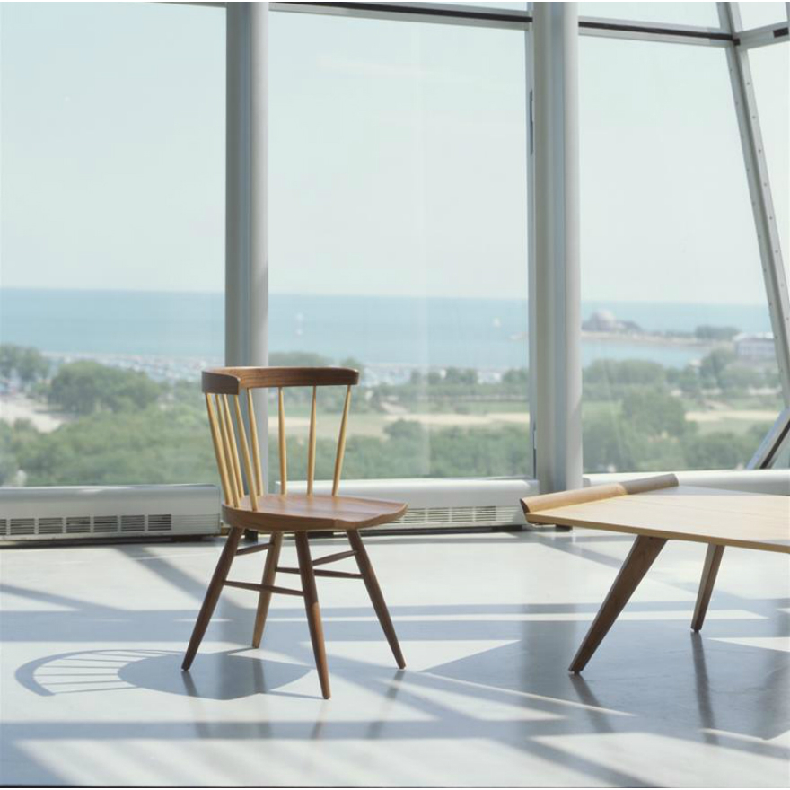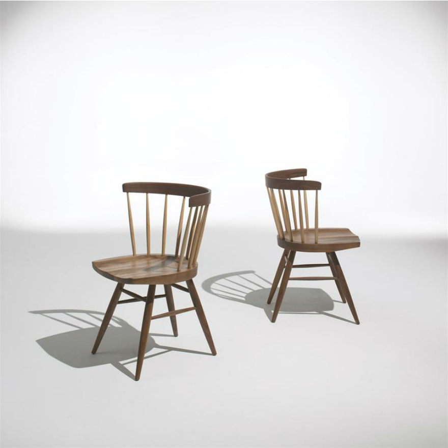 Straight Chair 是 George Nakashima 對傳統溫莎椅的現代詮釋。Nakashima 系列家具採用美國胡桃木和山核桃木等天然低光澤飾面和活木紋理圖案,充分體現了設計師的藝術造詣和精湛工藝。椅架採用美國胡桃木實木打造,椅腳和橫撐也同樣採用美國胡桃木車削而成,椅身則以對比鮮明的山核桃木條支撐,表面塗有低光澤清漆,並配有尼龍滑輪。每張椅子的座椅下方都印有喬治·中島的簽名。