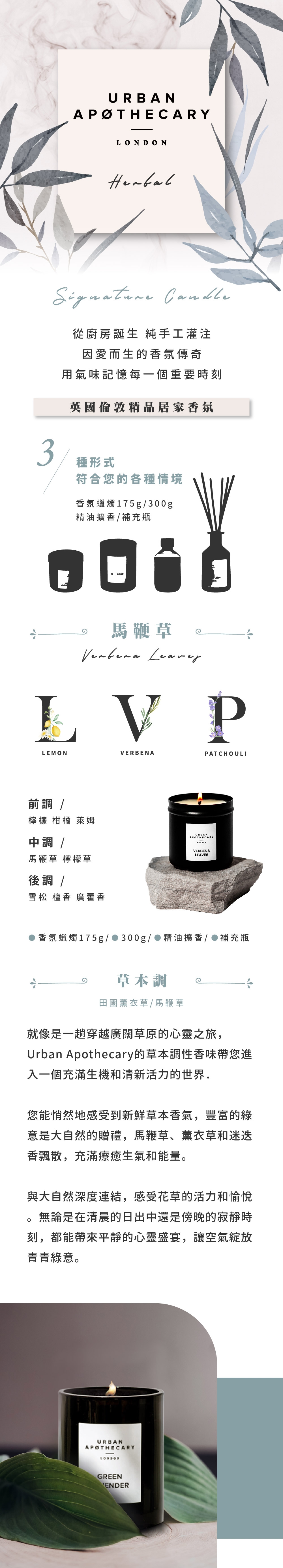 嚴選天然優質原料,結合純素大豆蠟均勻調配製成,無論是喜好果香、花香、木質香味,都能在 Urban Apothecary 細緻且豐富的香氛世界中找尋到最適合您的美好氣味,透過香氛蠟燭及精油擴香的陪伴,打造專屬於您的記憶香氛。