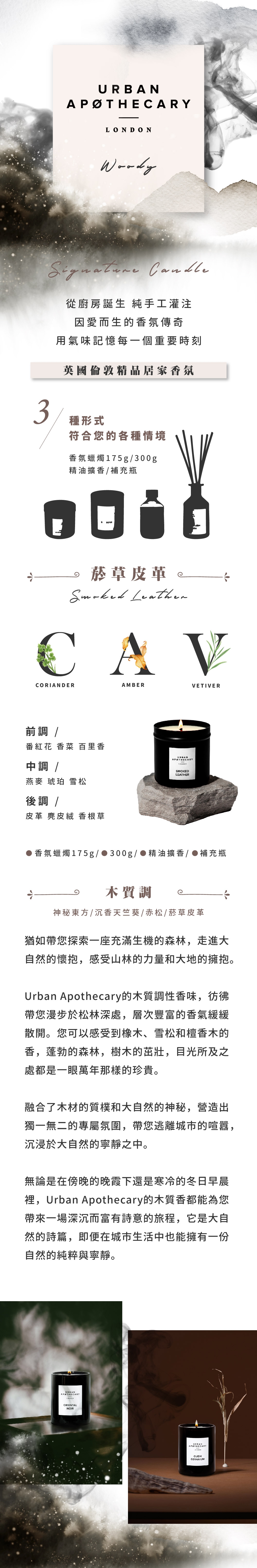嚴選天然優質原料,結合純素大豆蠟均勻調配製成,無論是喜好果香、花香、木質香味,都能在 Urban Apothecary 細緻且豐富的香氛世界中找尋到最適合您的美好氣味,透過香氛蠟燭及精油擴香的陪伴,打造專屬於您的記憶香氛。