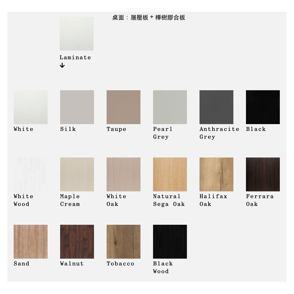 桌面:櫸木、橡木、層壓版+樺樹膠合板、Fenix+樺樹膠合板、陶瓷+樺樹膠合板