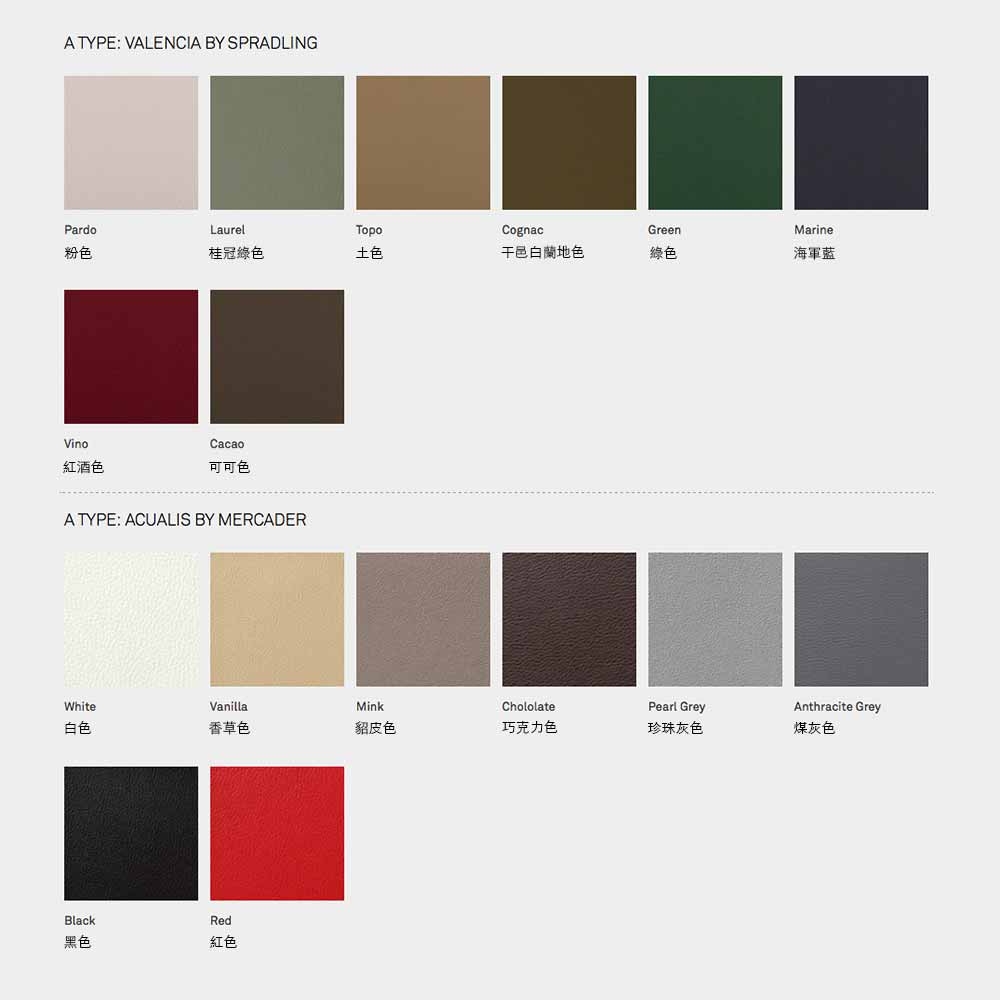 有多種布料、皮革及顏色可供選擇,請參考材質表