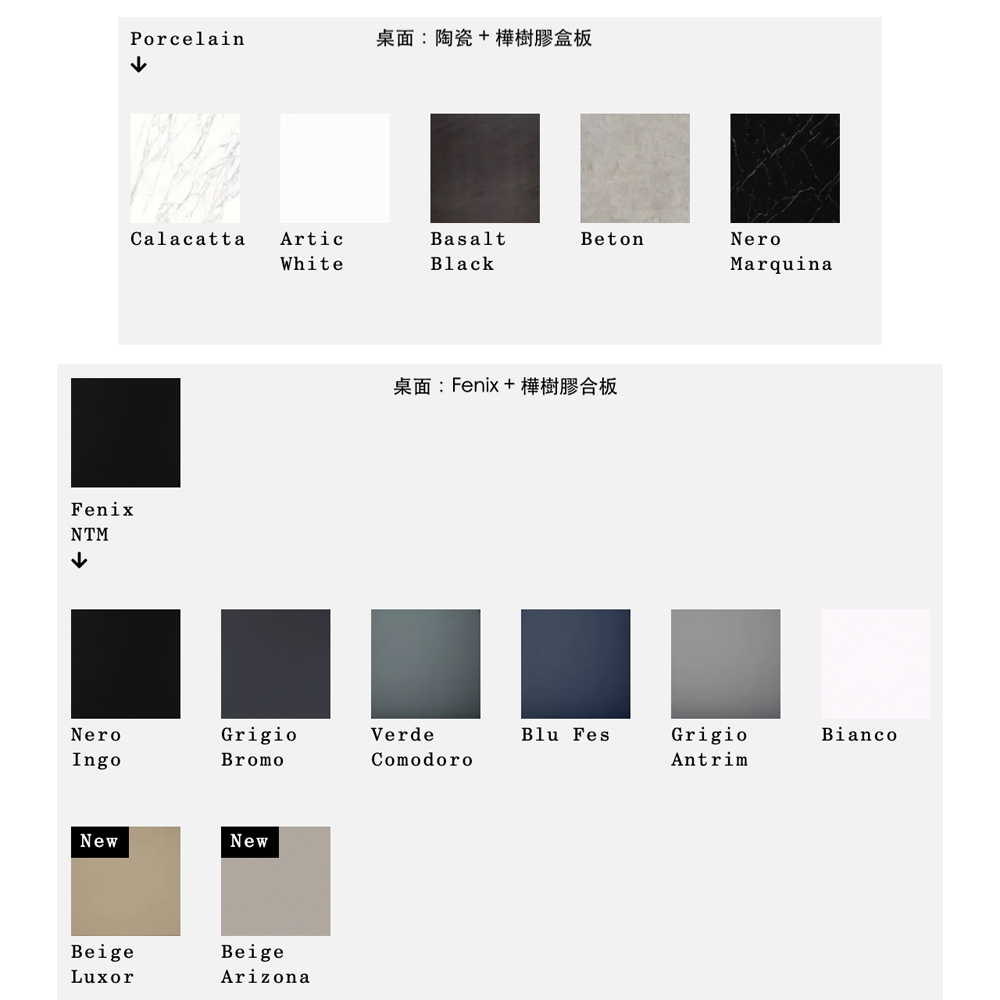 桌面:(1) 層壓版+樺樹膠合板 (2) Fenix+樺樹膠合板 (3) 陶瓷+樺樹膠合板