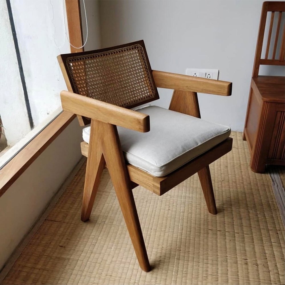 Jeanneret對於傢俱設計的特點在於他對於傢俱材質的敏感度,他利用一些基本的幾何形狀作為木質椅的設計,藉此讓產品散發出溫暖且自然感覺。Jeanneret在家具方面最出色的作品是在昌迪加爾完成的,這些都是他最近才贏得的名聲。 由柚木製成,設計從低矮的躺椅和扶手椅,藤椅到桌子和桌子,大部分都使用了Jeanneret的標誌幾何形。