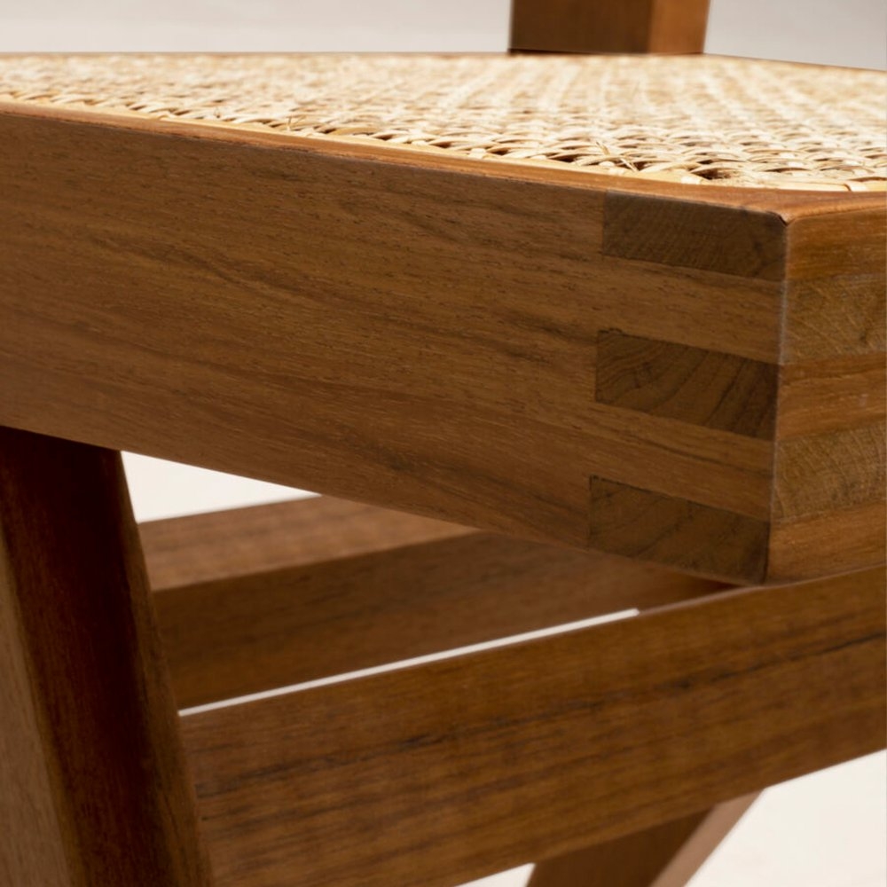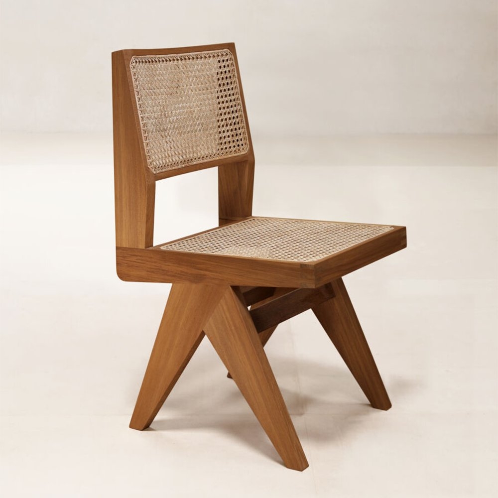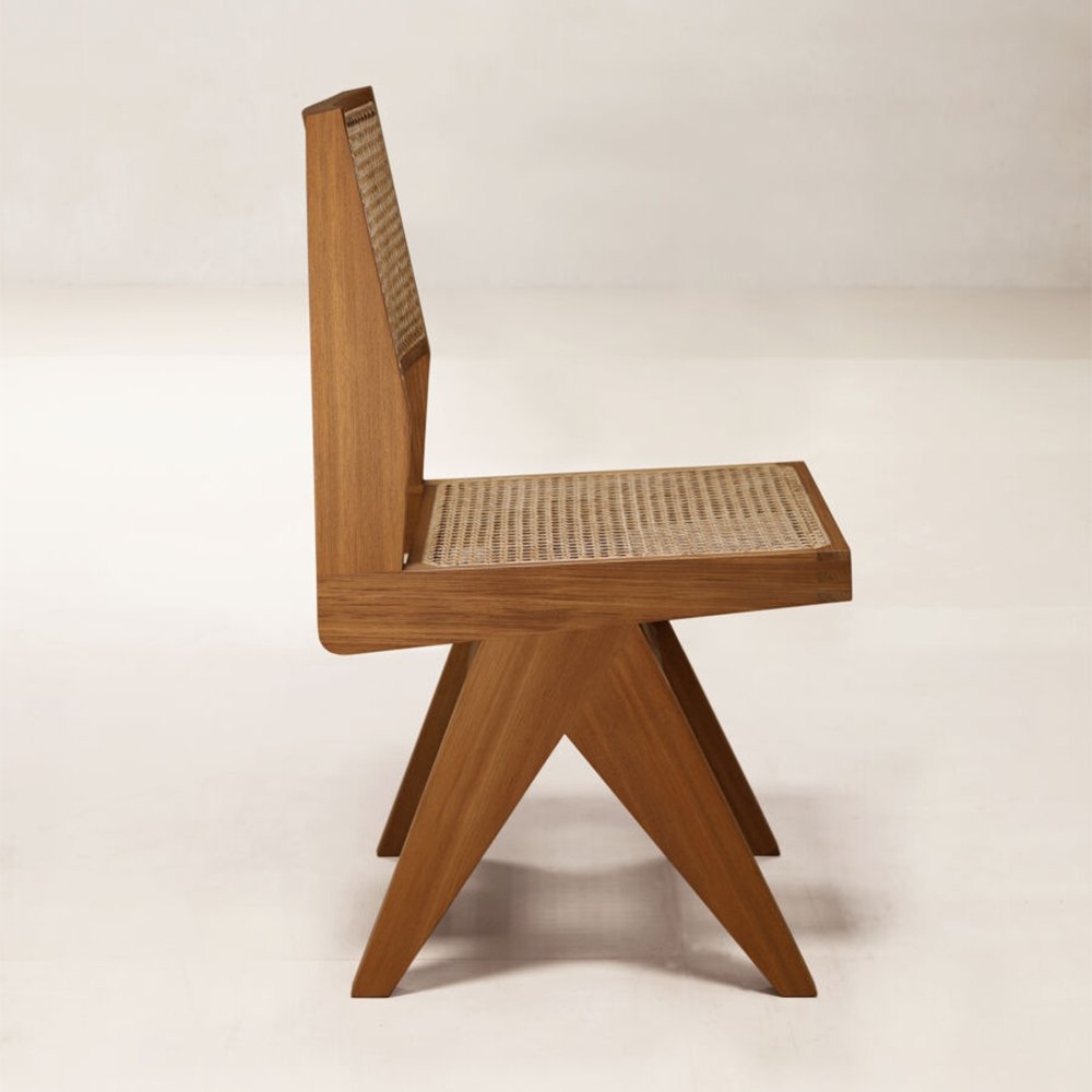 無扶手餐椅的當代重新生產版,最初是為昌迪加爾的旁遮普大學設計的。 椅子有經典'V'型喇叭三角形腿,兩個扁平橫桿支撐腿部。椅子是完全手工製作的,椅子卡榫、座椅傾斜及靠背彎曲的角度,扶手和椅腳長度的邊緣柔和圓角等微小細節在重新製作的版本中皆給予了應有的重視,更為細緻。保留原件的質樸元素,除了柚木原色外還有黑色版本可以選擇。