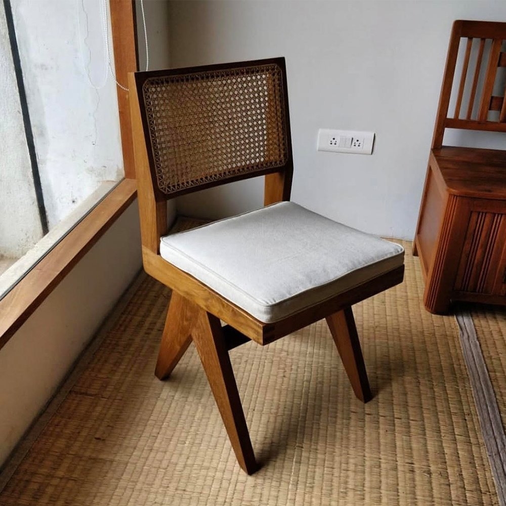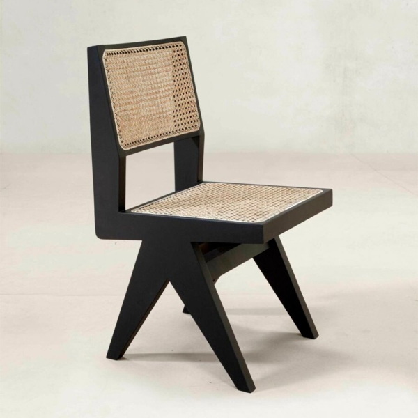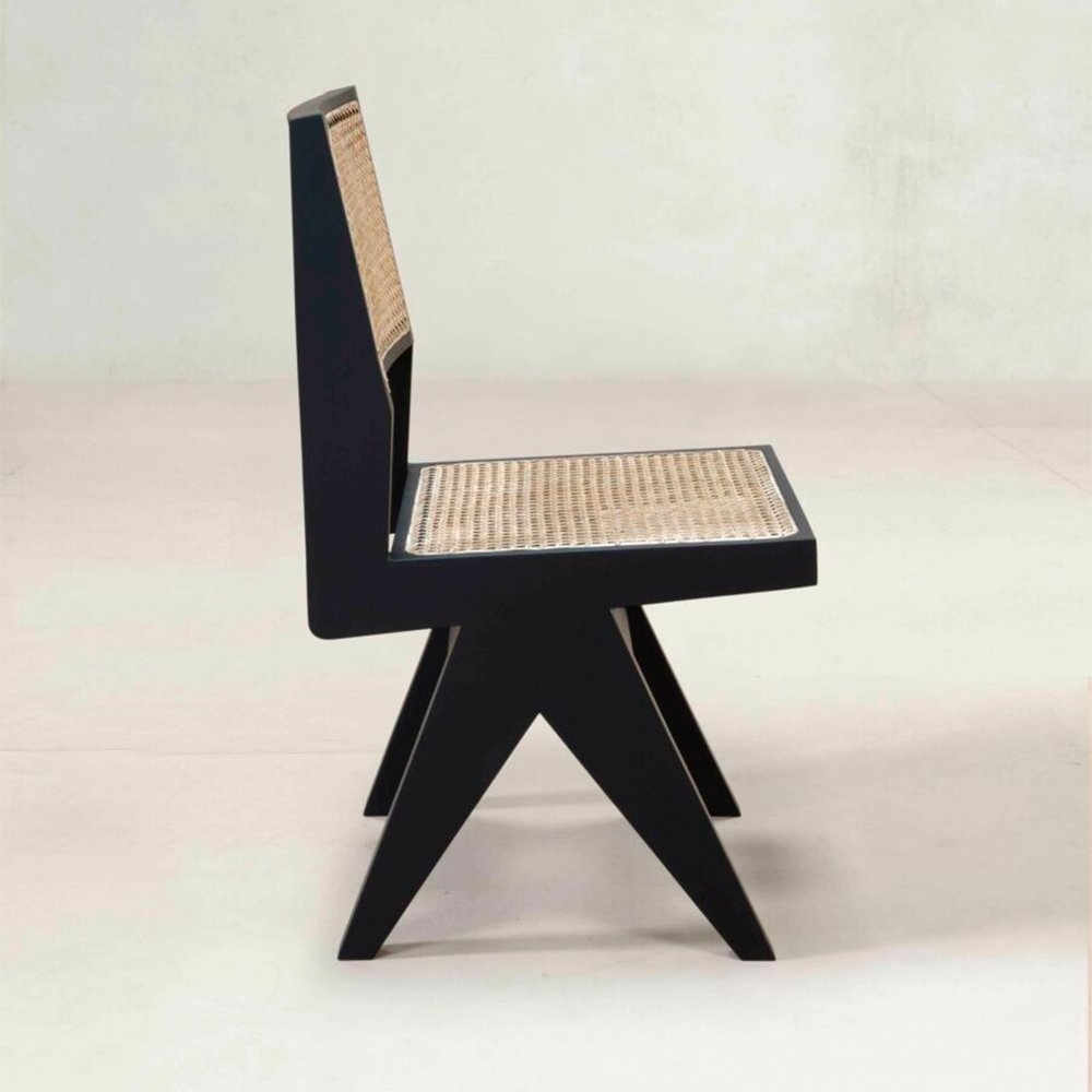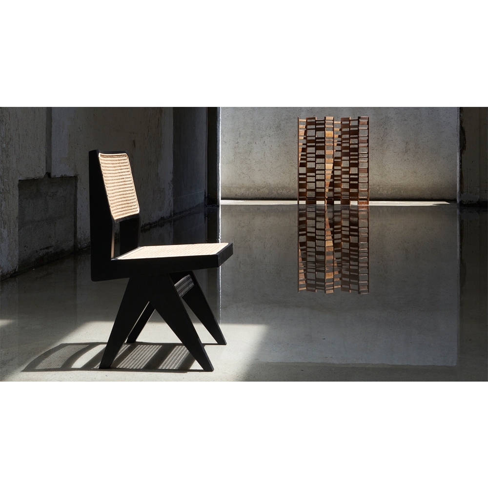 無扶手餐椅的當代重新生產版,最初是為昌迪加爾的旁遮普大學設計的。 椅子有經典'V'型喇叭三角形腿,兩個扁平橫桿支撐腿部。椅子是完全手工製作的,椅子卡榫、座椅傾斜及靠背彎曲的角度,扶手和椅腳長度的邊緣柔和圓角等微小細節在重新製作的版本中皆給予了應有的重視,更為細緻。保留原件的質樸元素,除了黑色版本外還有柚木原色版本可以選擇。