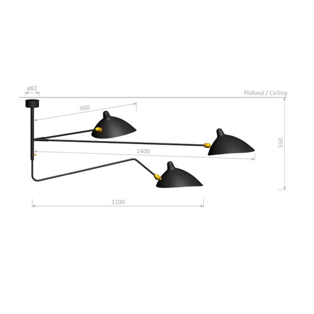 Ceiling lamp 2 fixed arms 1 rotating curved arm - 1956