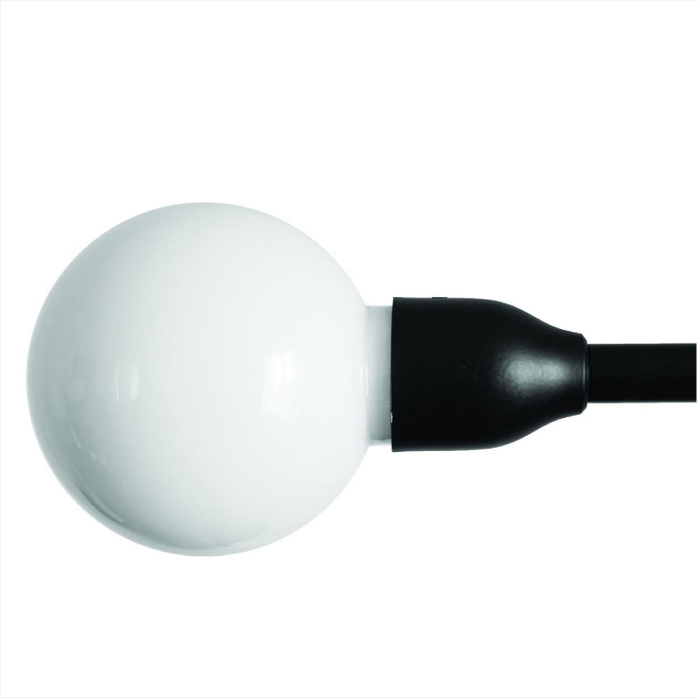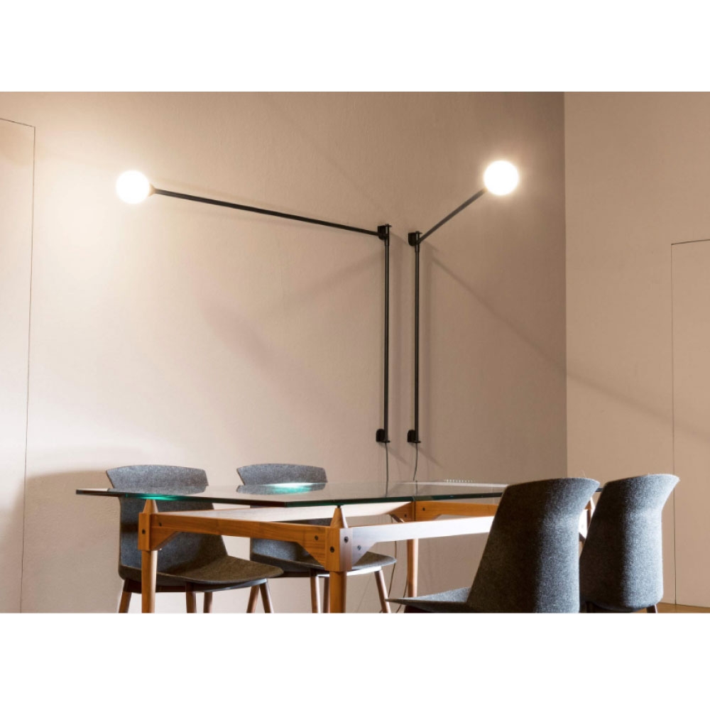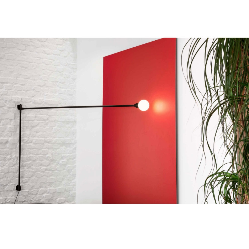 Charlotte Perriand 浮懸L型壁燈。採用鋁和金屬材質,漆成霧面黑色。 燈罩則是圓形玻璃泡。支臂固定在牆上並旋轉到水平軸,呈180°角。附插頭和可調光器的電源線。