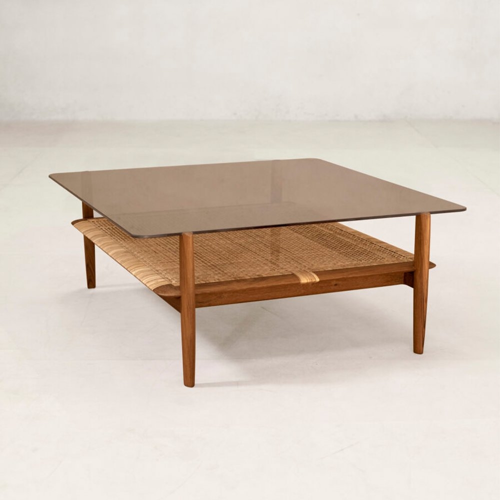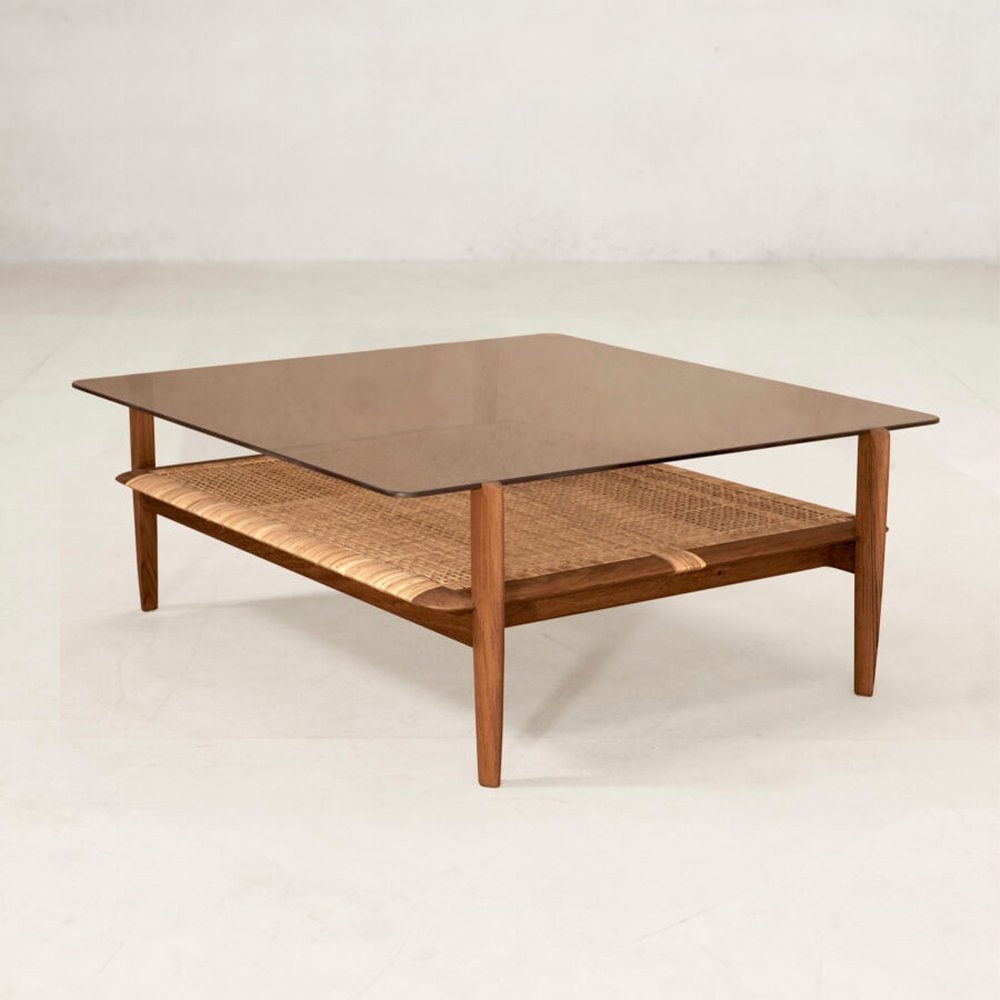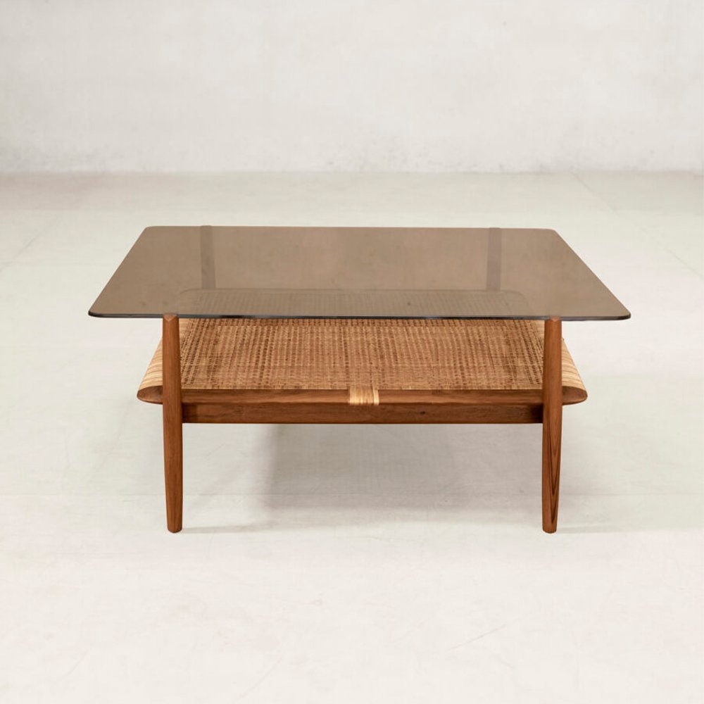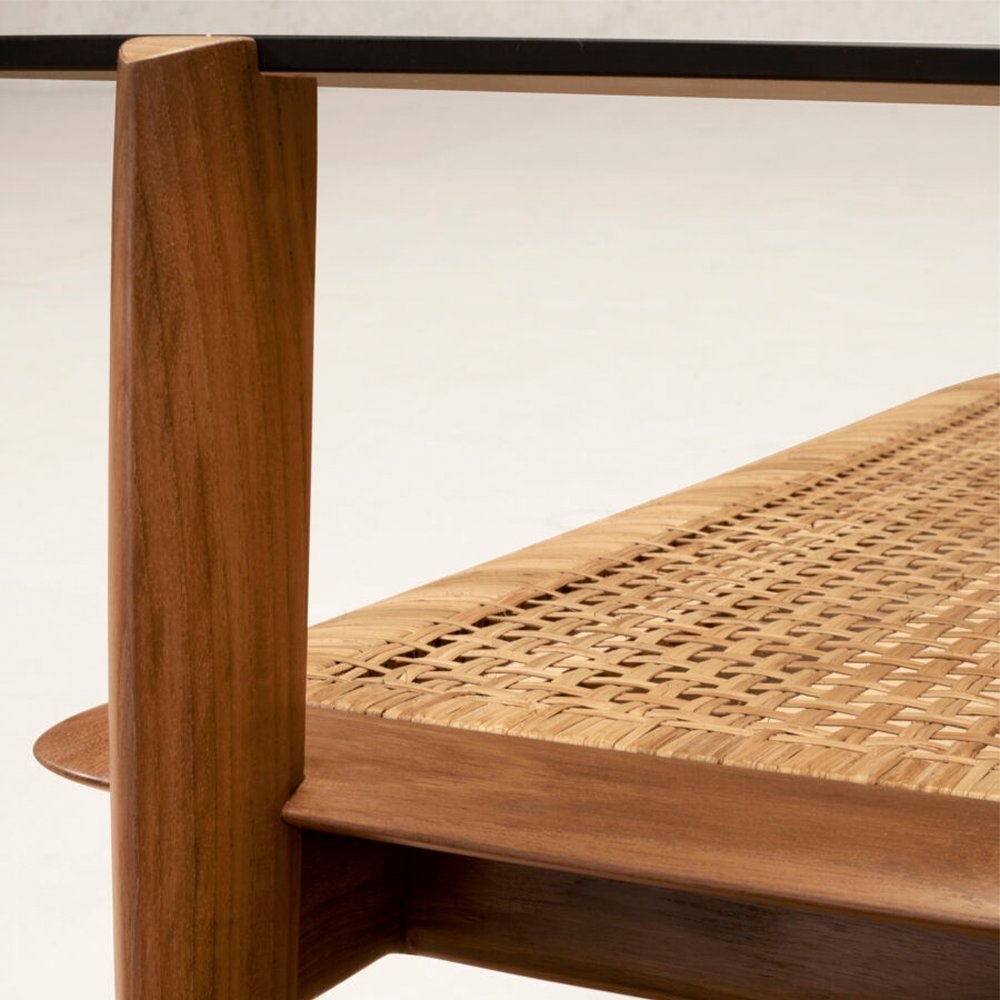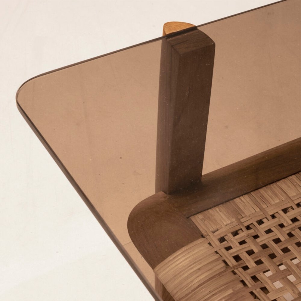 Tangāli 咖啡桌的玻璃桌面帶有淡淡的褐色,在玻璃下方是手工編織的藤架。