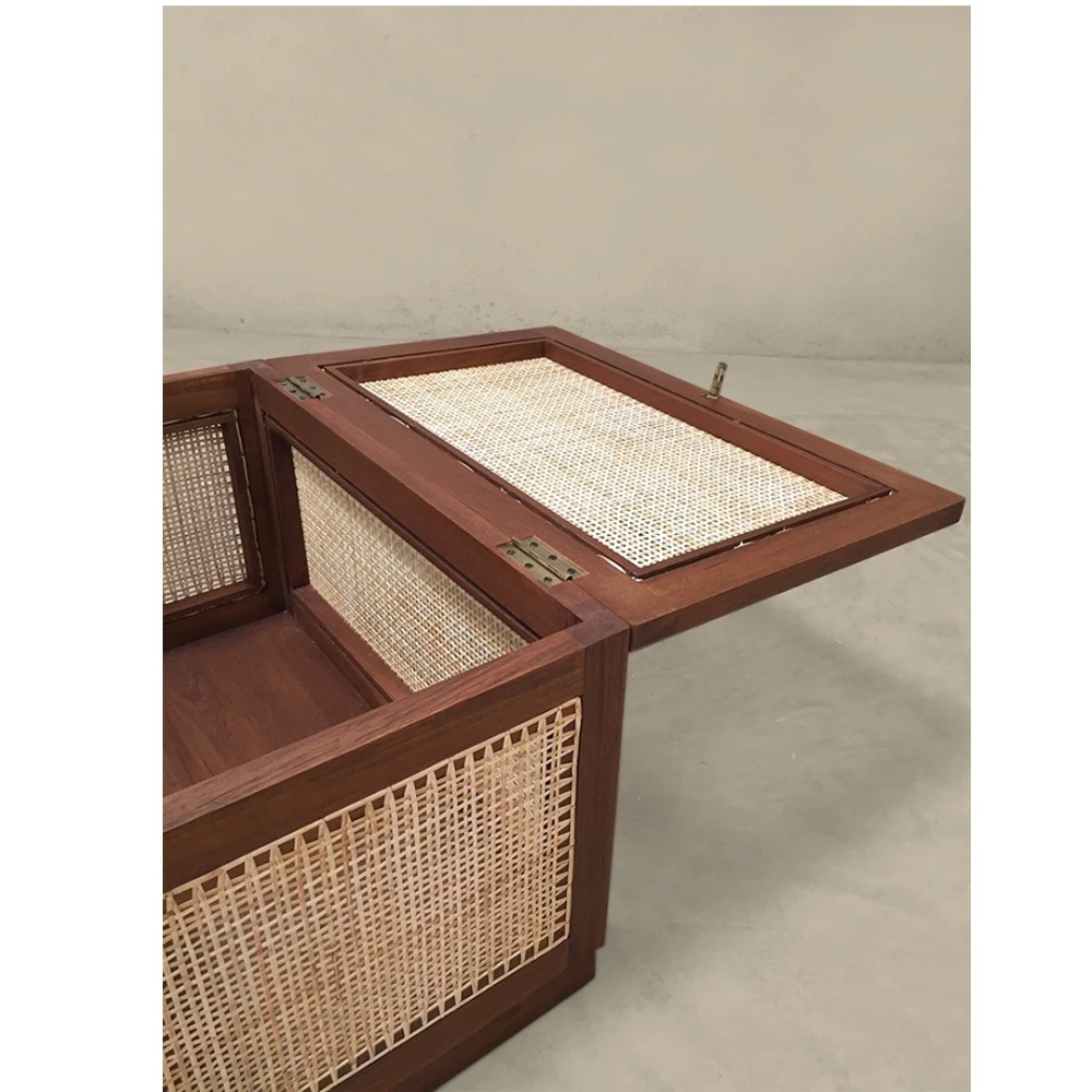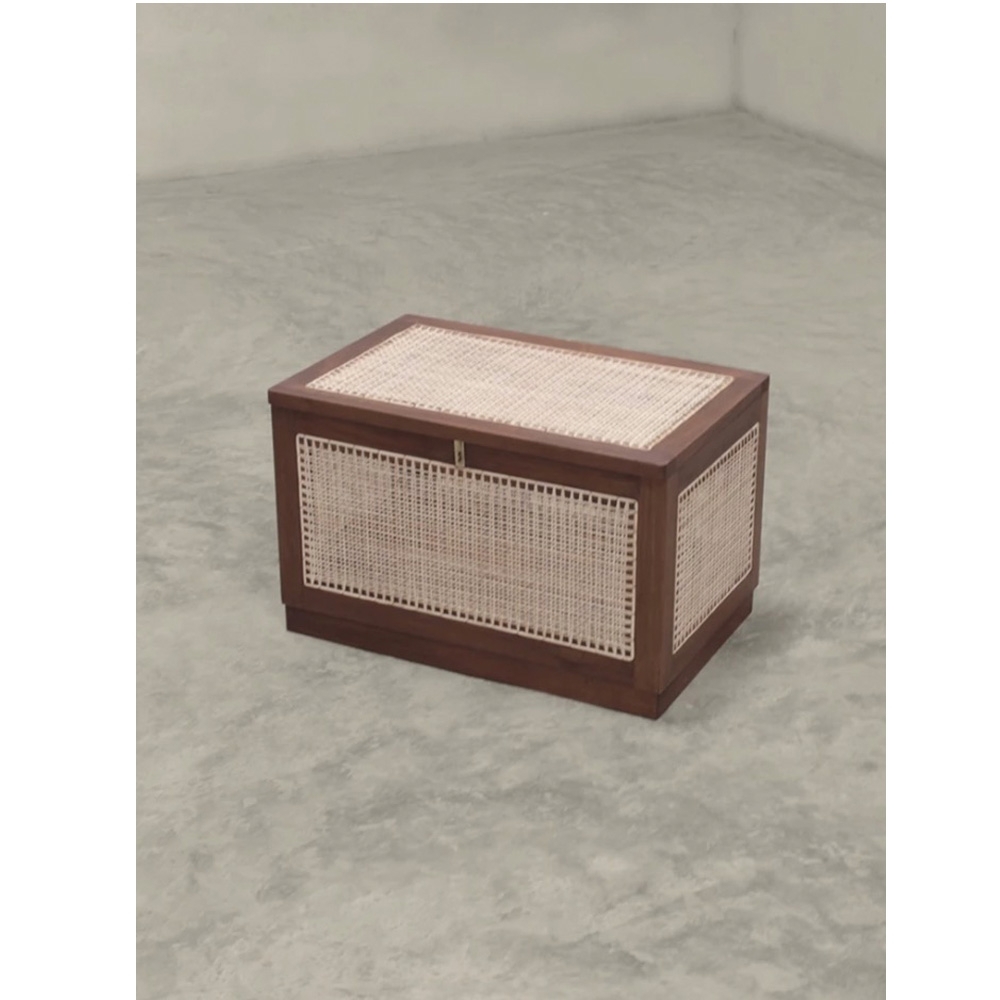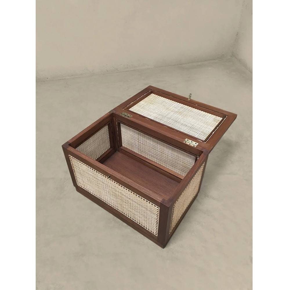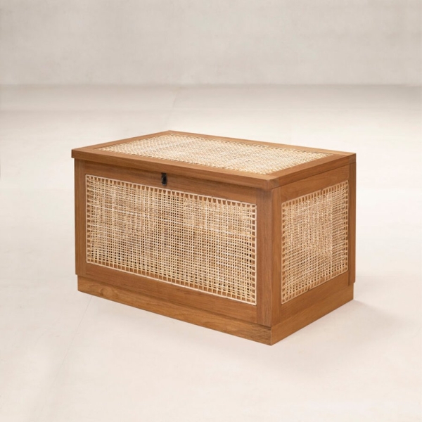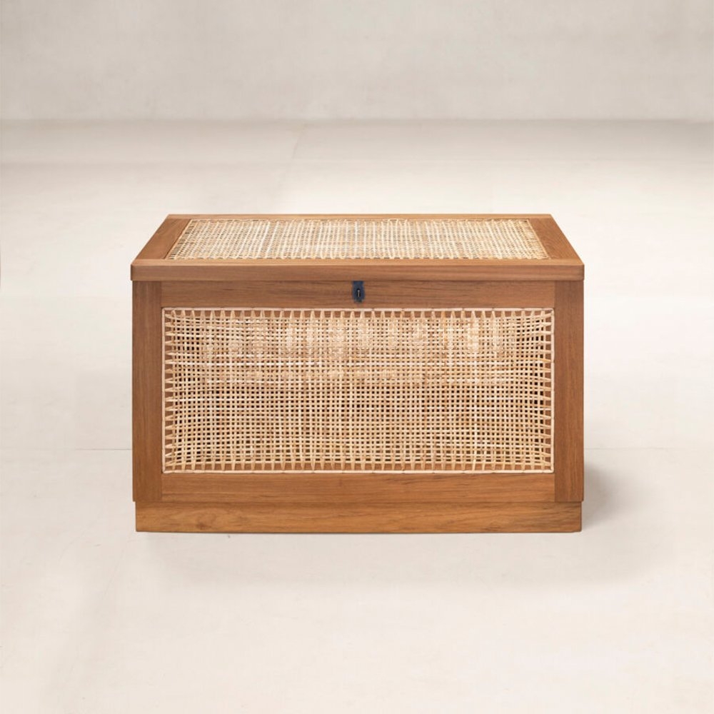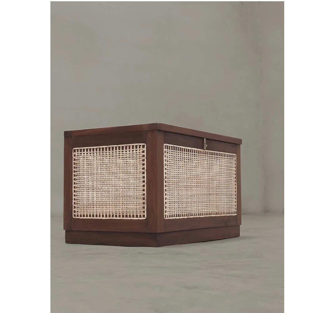 “洗衣籃”或“髒亞麻籃”的柚木框架在五個側面都帶有手工製作的編織。頂部翻蓋借助黃銅鎖和連接鏈打開。