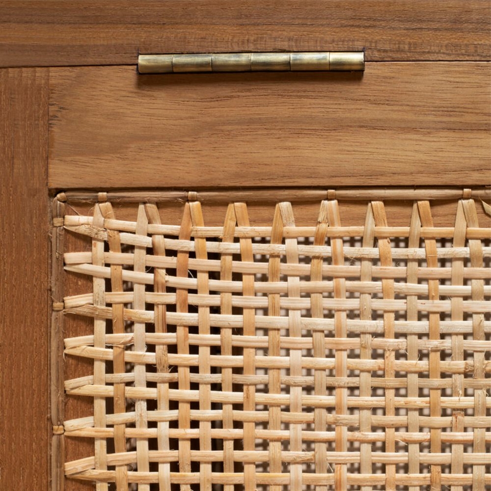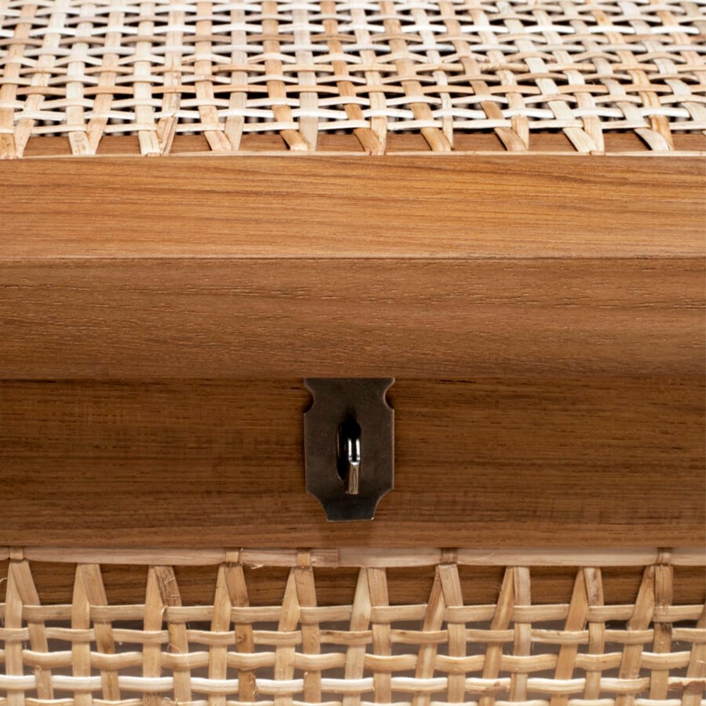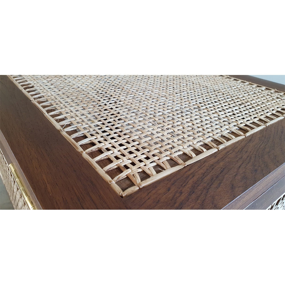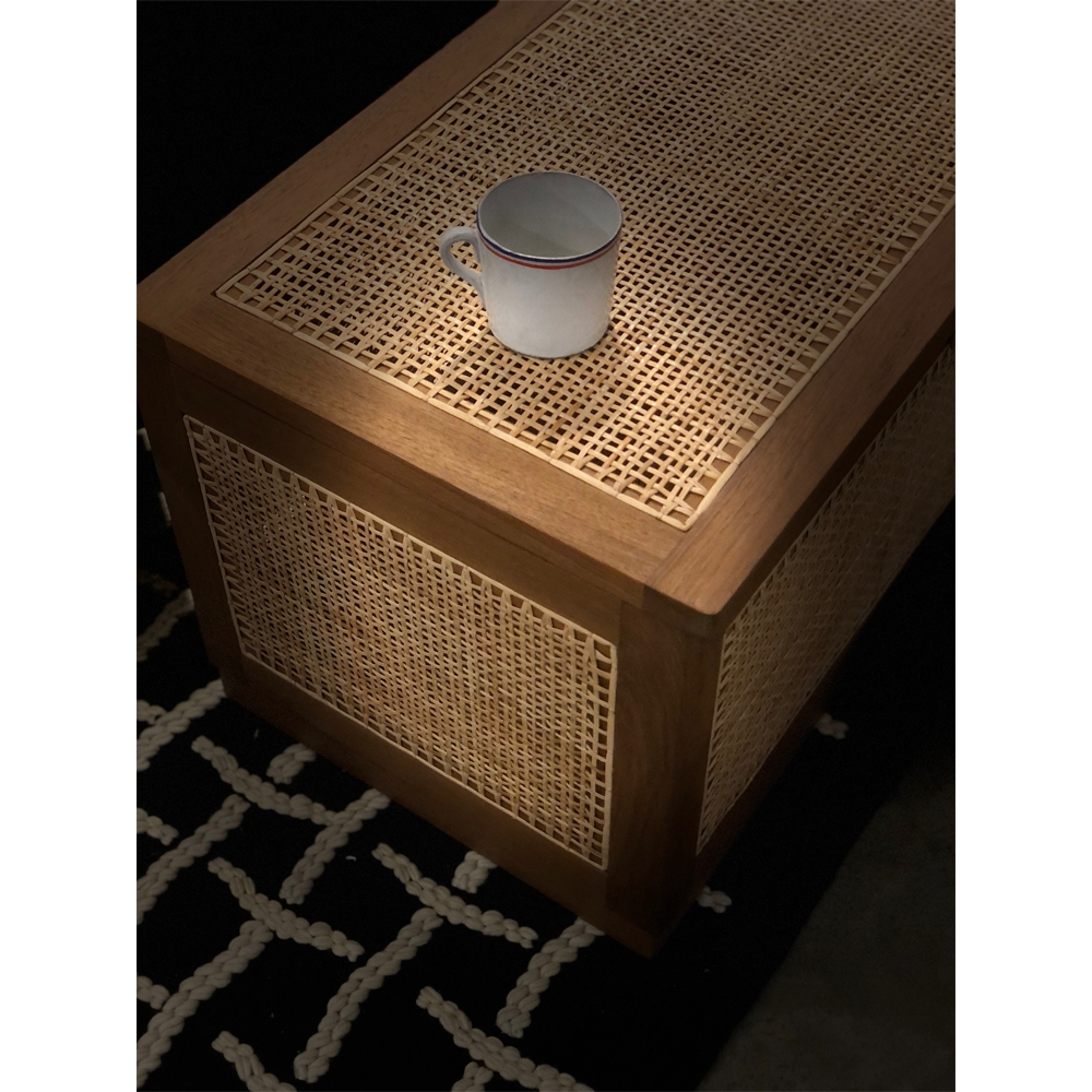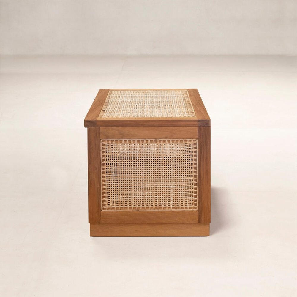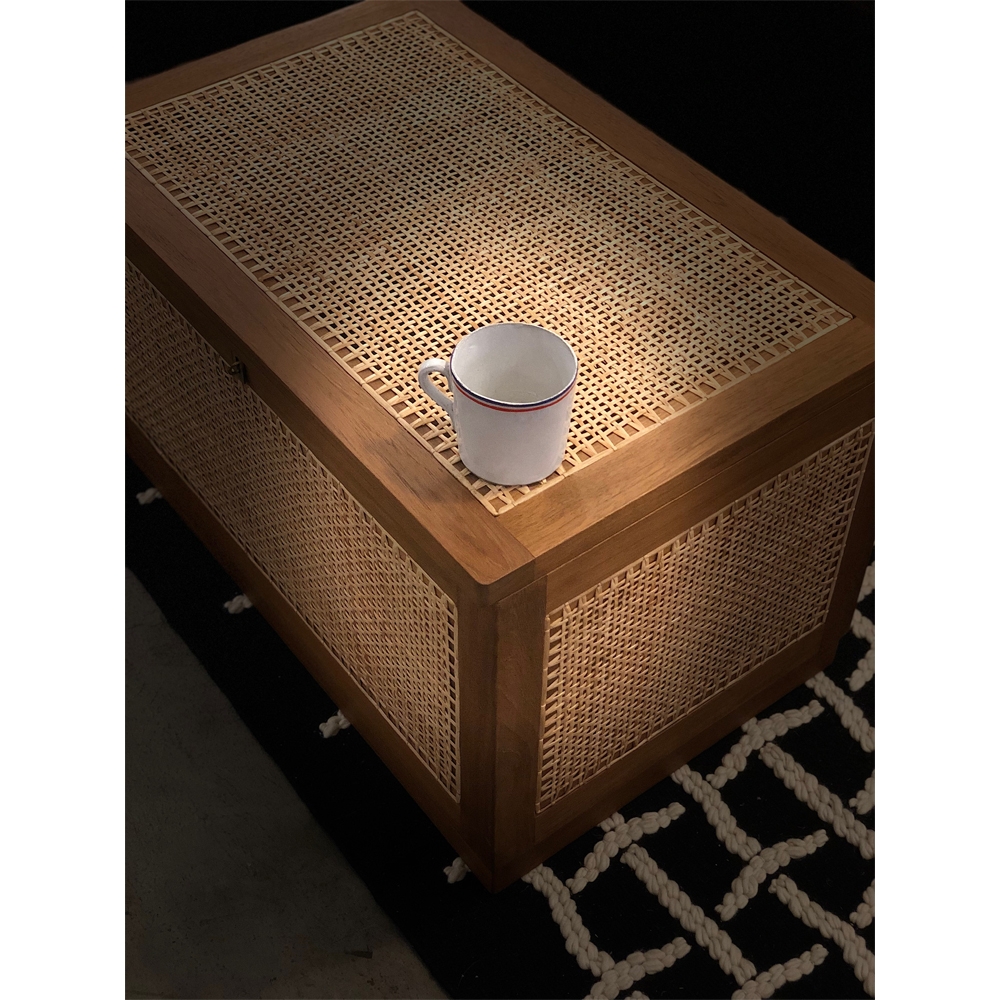 “洗衣籃”或“髒亞麻籃”的柚木框架在五個側面都帶有手工製作的編織。頂部翻蓋借助黃銅鎖和連接鏈打開。
