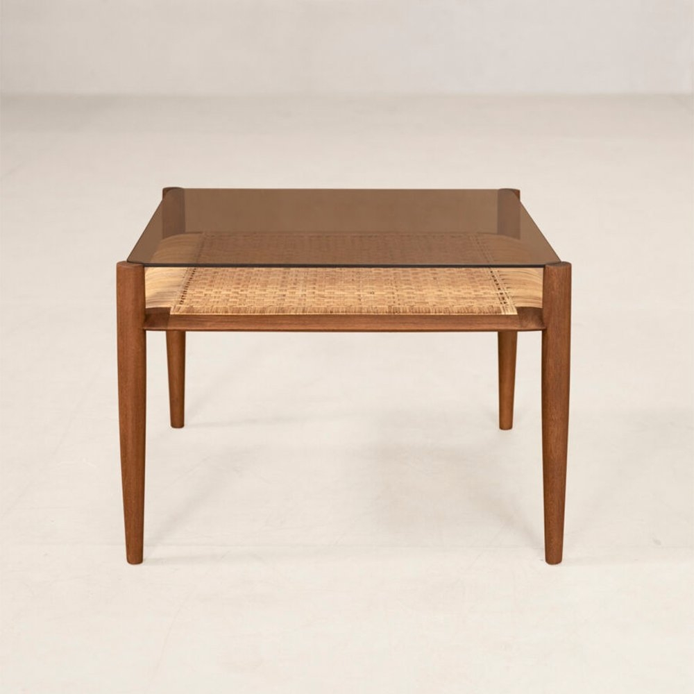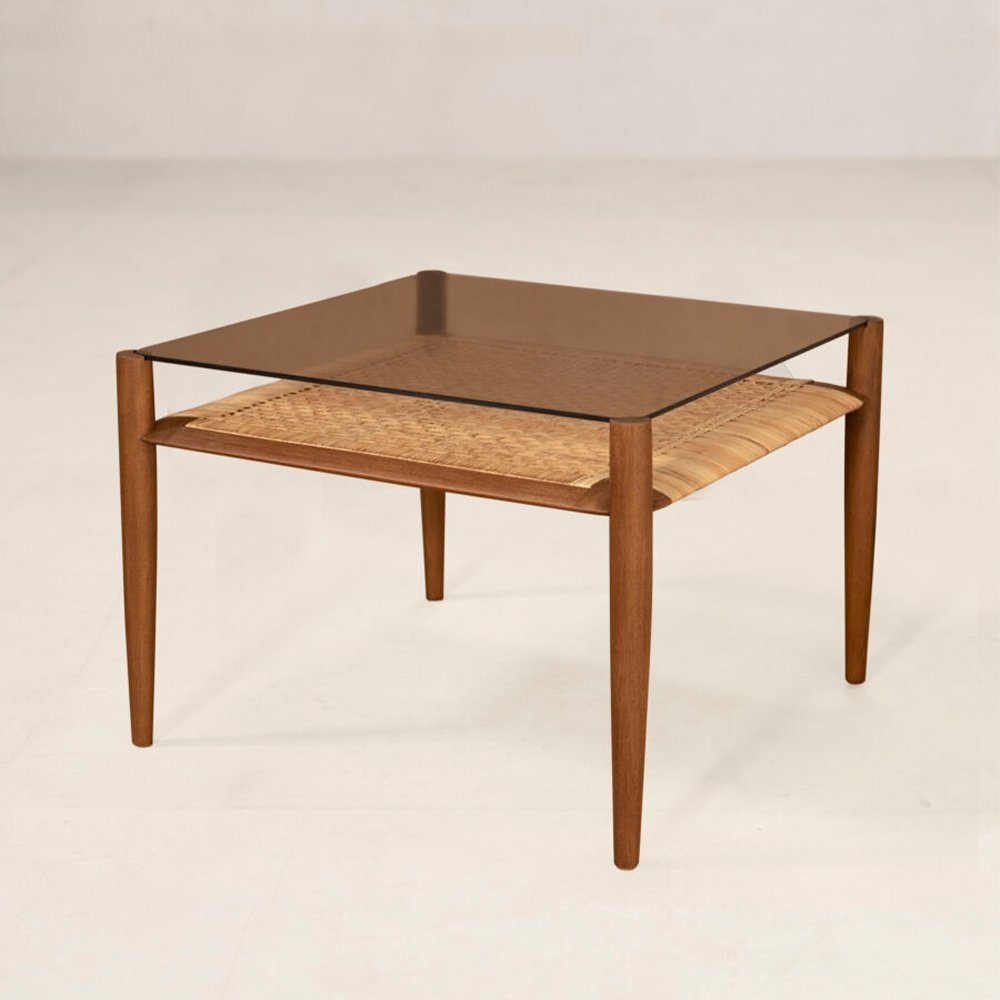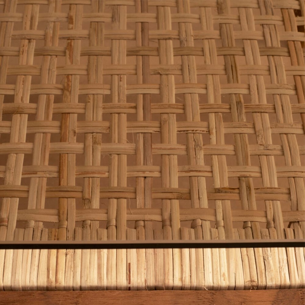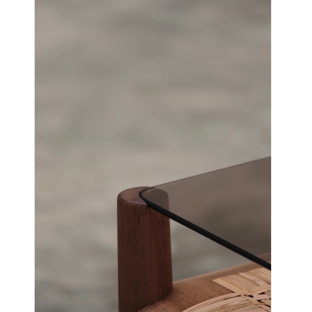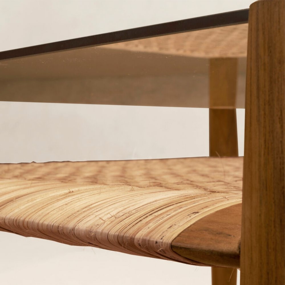 Tangāli 邊桌可以用作獨立的邊桌,玻璃桌面帶有淡淡的褐色,在玻璃下方是手工編織的藤架,可用於放置書籍和雜誌。
