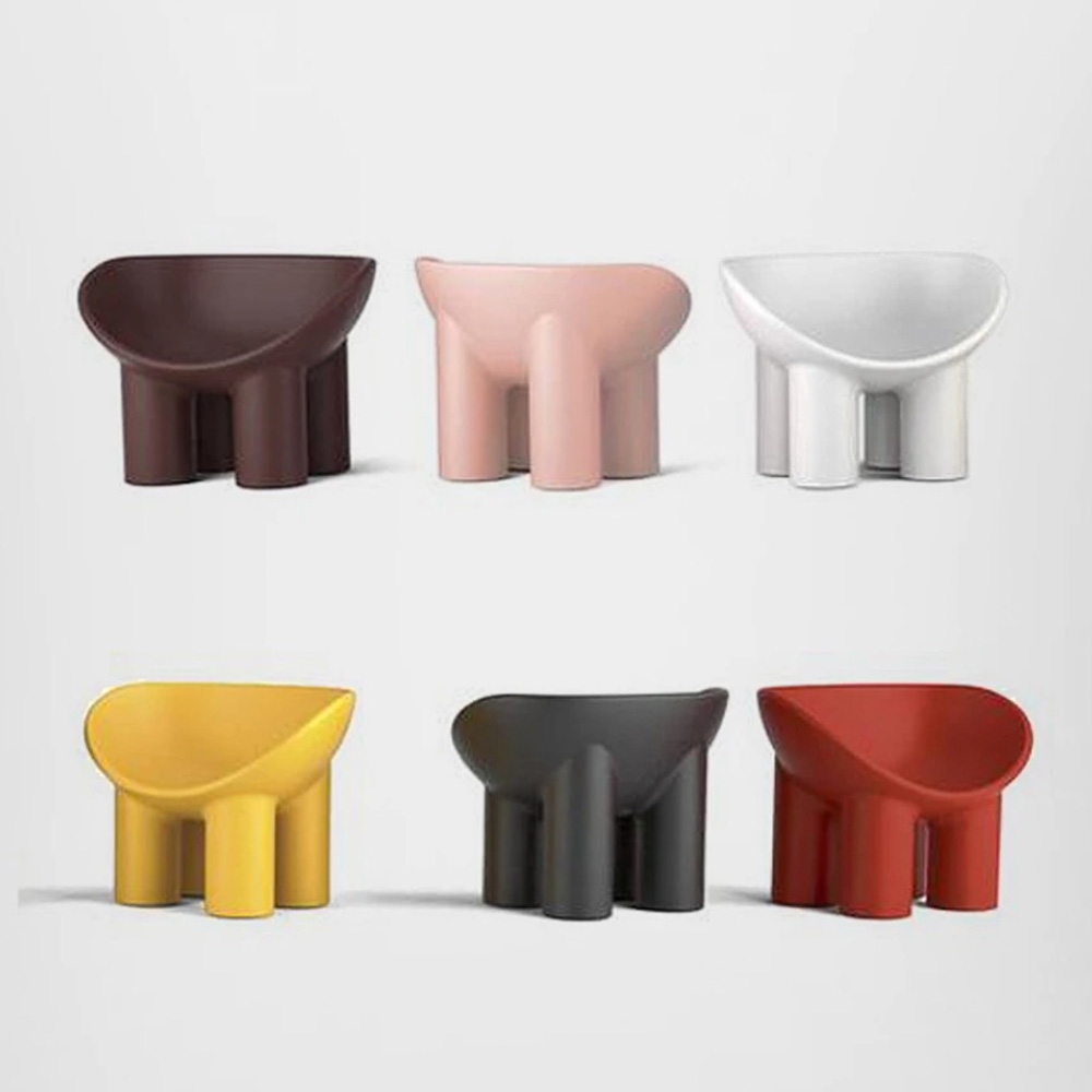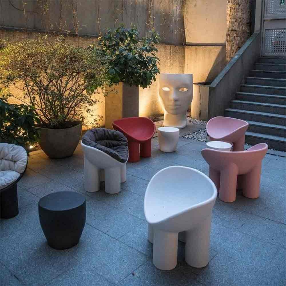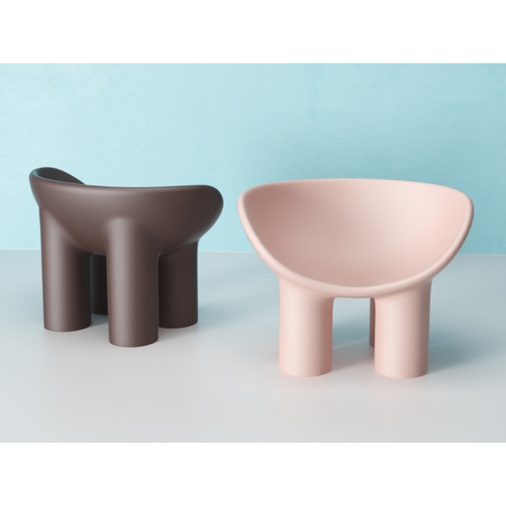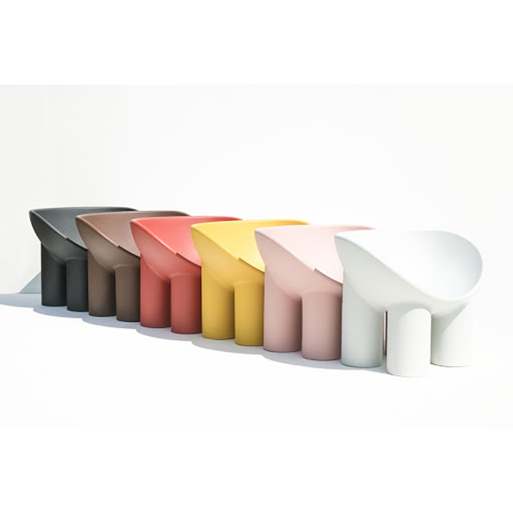 Faye Toogood 與義大利品牌 Driade 合作,將 Roly Poly 的美學,以塑料材質演繹,維持勺狀座面優美的拱形、以及四隻堅實壯碩的椅腿,不同之處在於塑料易於清理且耐用,放置室內和室外皆合適,價格相較於玻璃纖維版本,也更加平易近人。此外,塑料版擁有六款配色,可隨空間轉換自由選配色系。塑料版可另行加購軟墊,靠墊呈弧形碗狀,完美貼合椅面。
