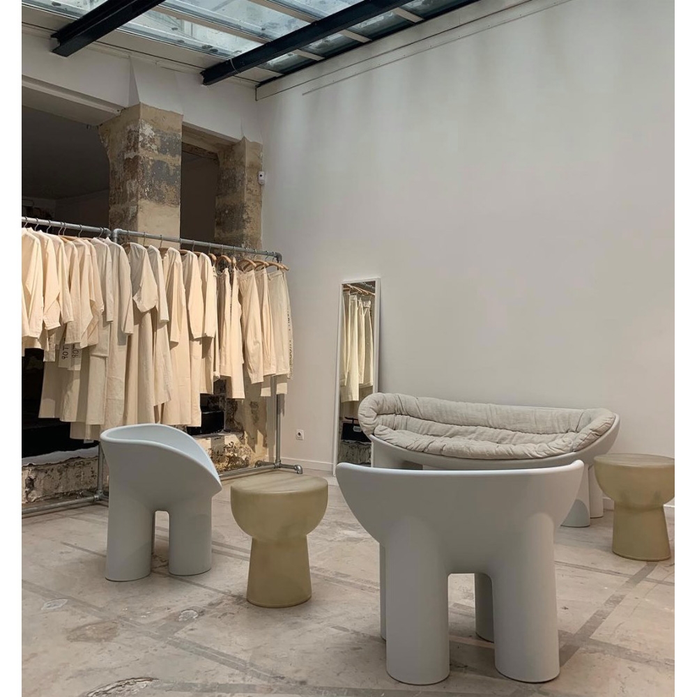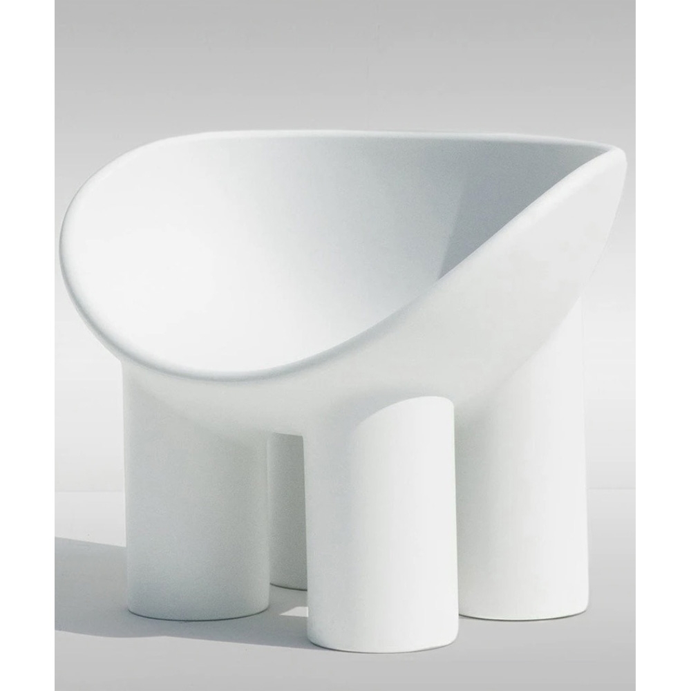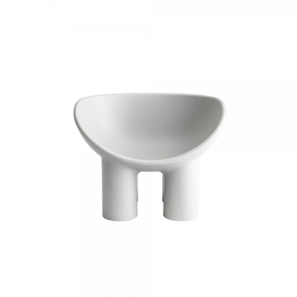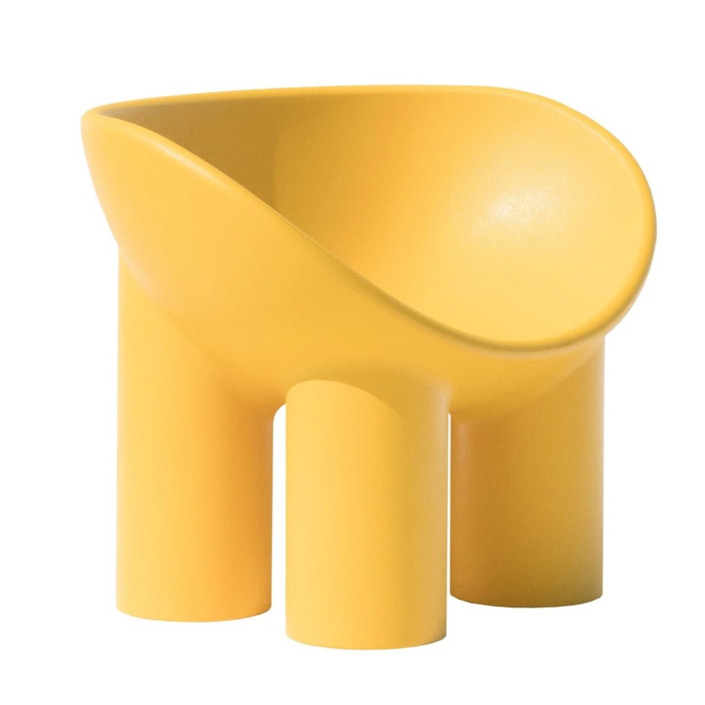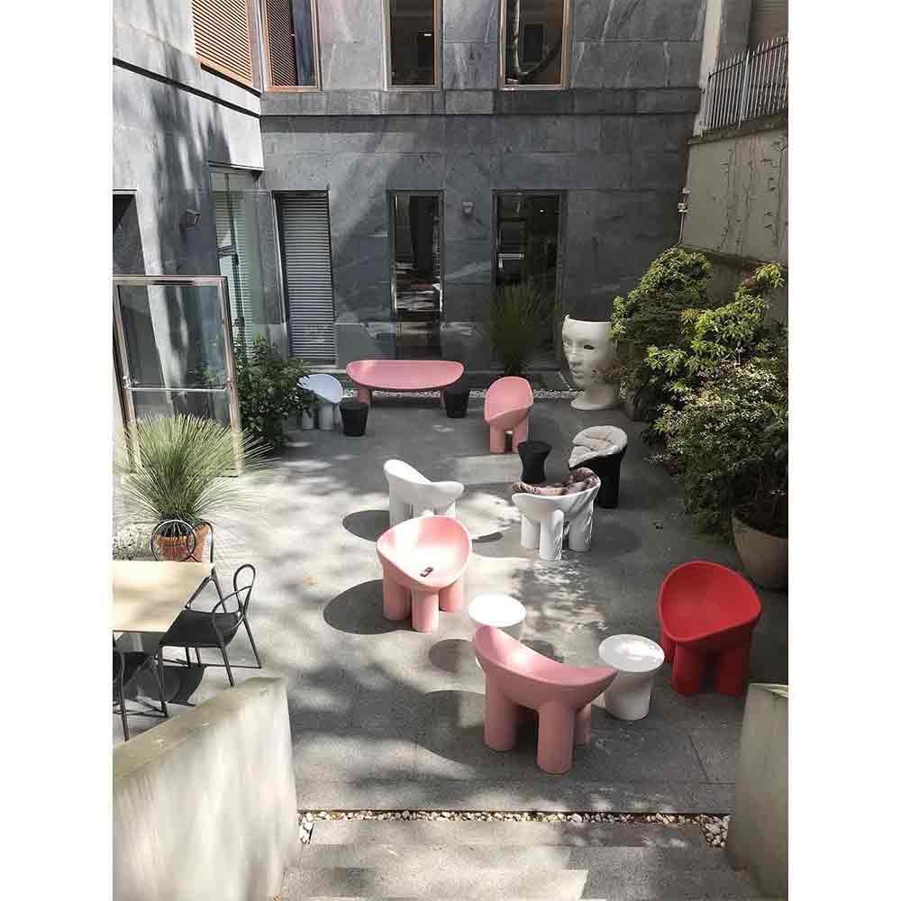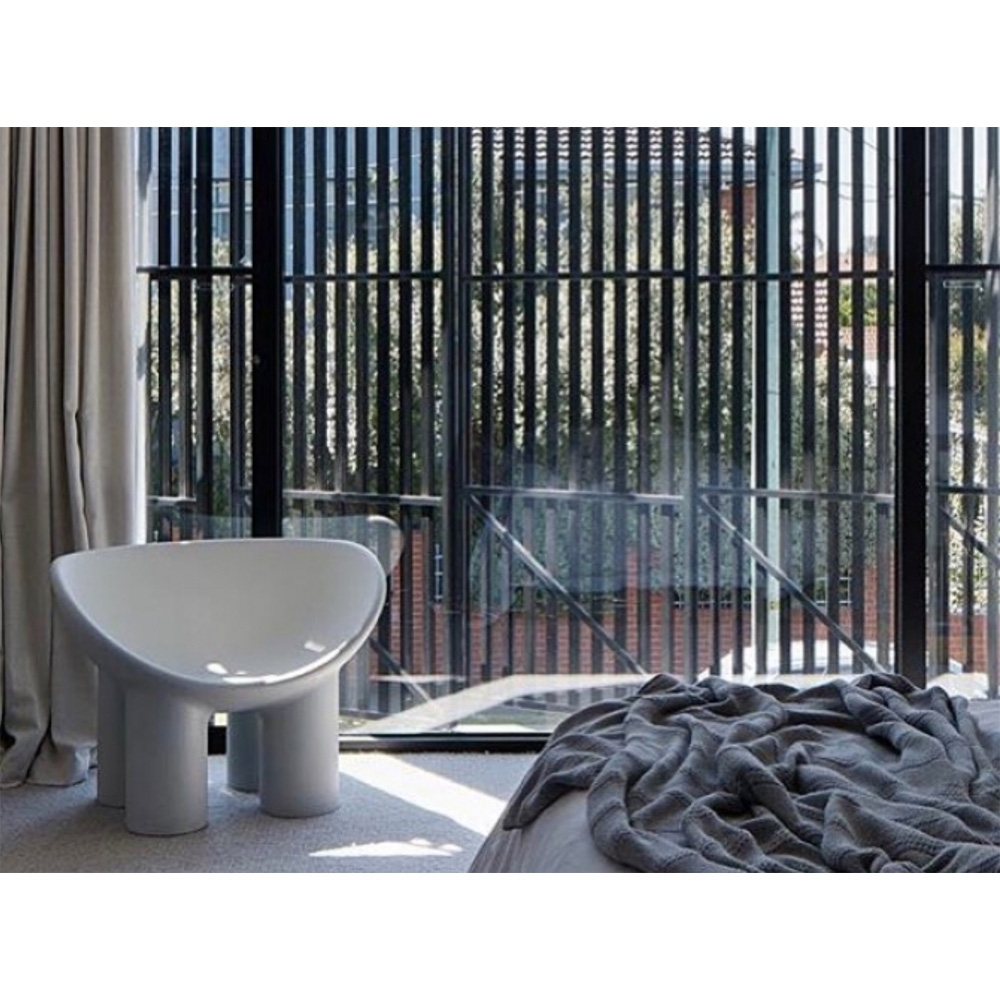 Faye Toogood 與義大利品牌 Driade 合作,將 Roly Poly 的美學,以塑料材質演繹,維持勺狀座面優美的拱形、以及四隻堅實壯碩的椅腿,不同之處在於塑料易於清理且耐用,放置室內和室外皆合適,價格相較於玻璃纖維版本,也更加平易近人。此外,塑料版擁有六款配色,可隨空間轉換自由選配色系。塑料版可另行加購軟墊,靠墊呈弧形碗狀,完美貼合椅面。