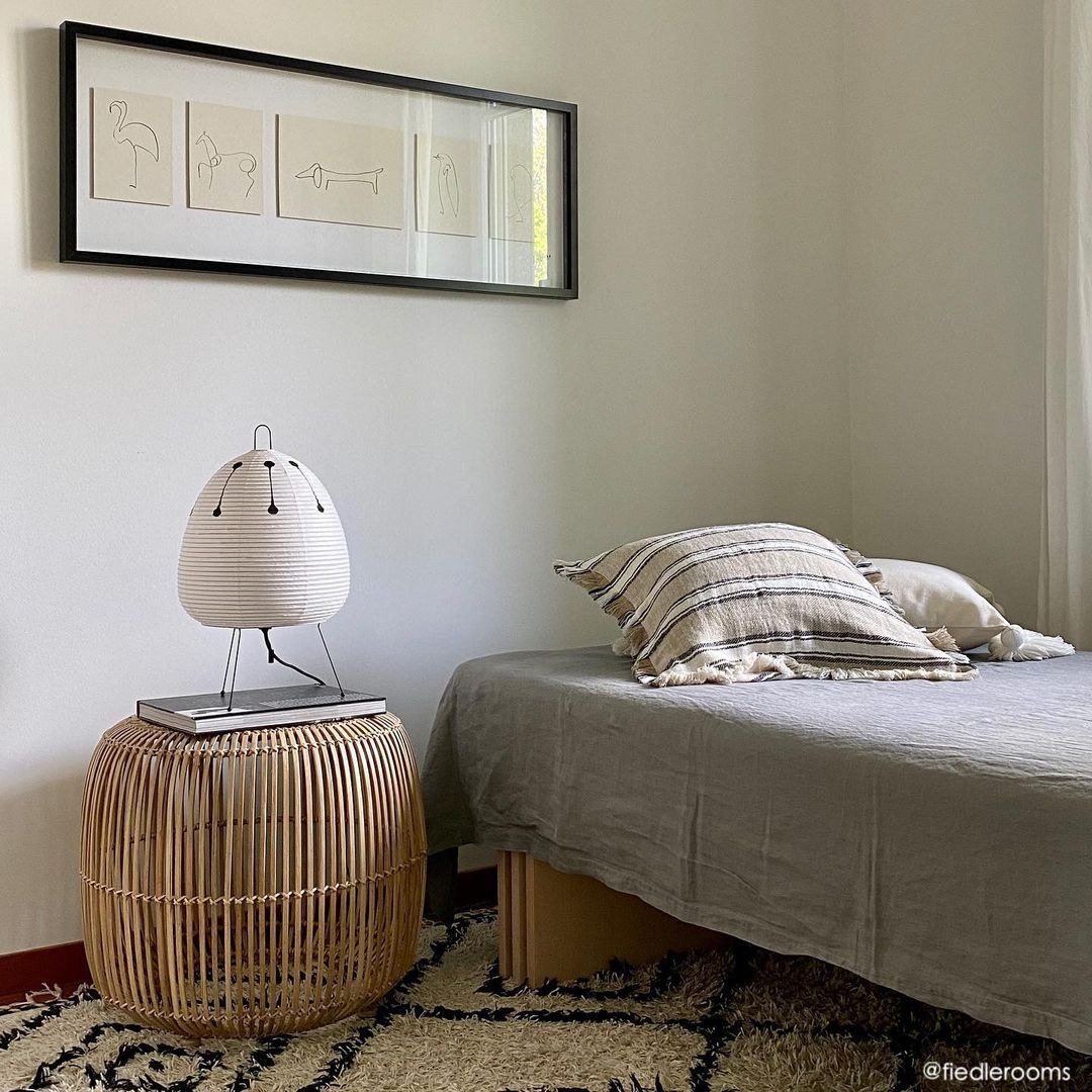 Akari 燈具採用日本和紙與竹編燈體結構,腳架及頂端則是金屬材質,建議使用40 瓦燈泡。