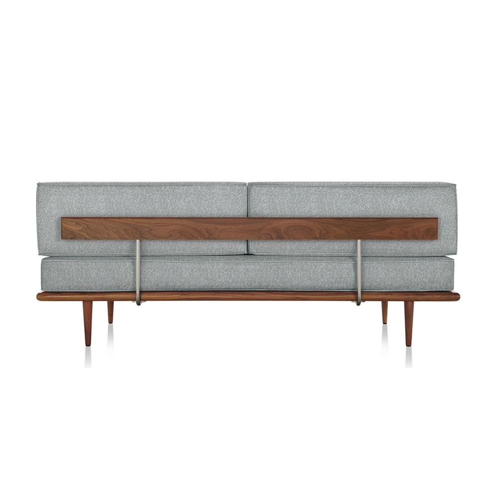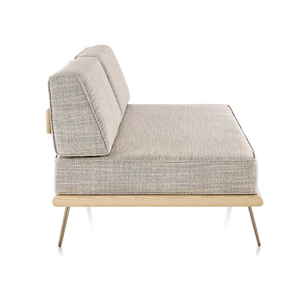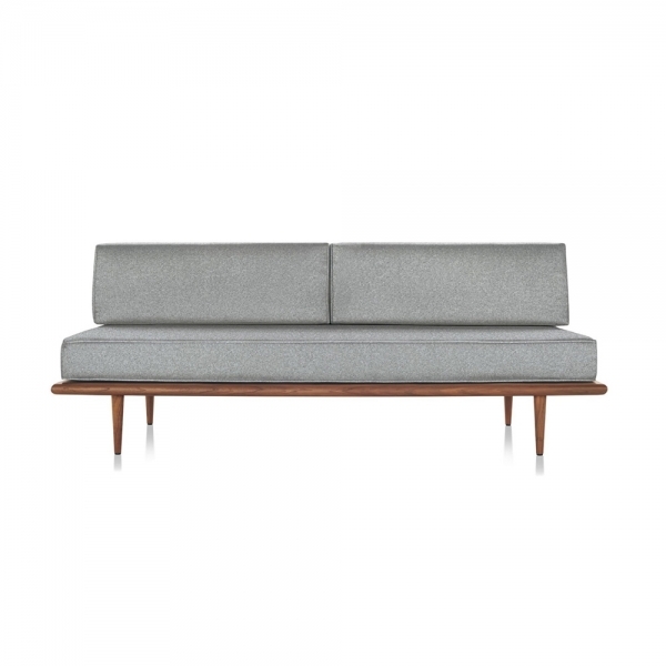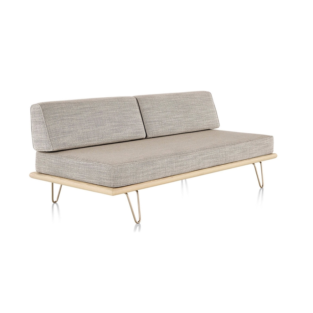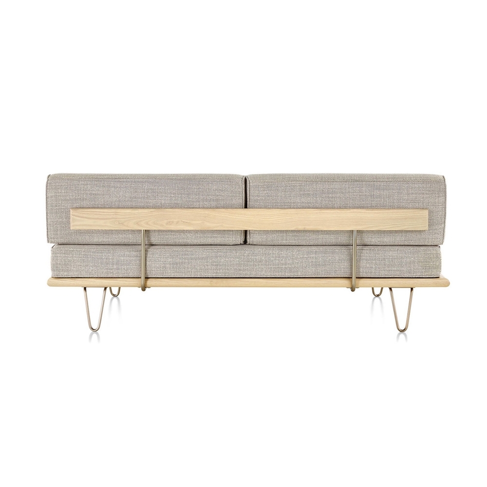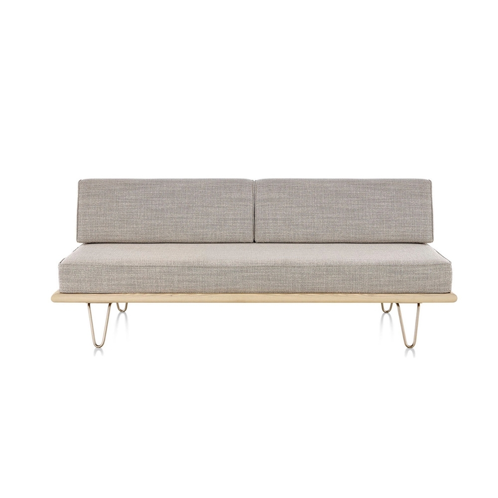 帶兩個枕墊的沙發床可選用胡桃木或白蠟木框架。 而支撐處既可以採用緞面鍍鉻的髮夾金屬椅腳,也可以採用胡桃木或白蠟木的木質系椅腳。 坐墊有五種材質及多種顏色供選擇。