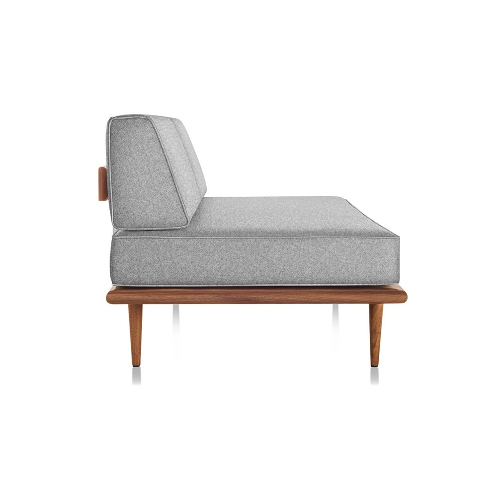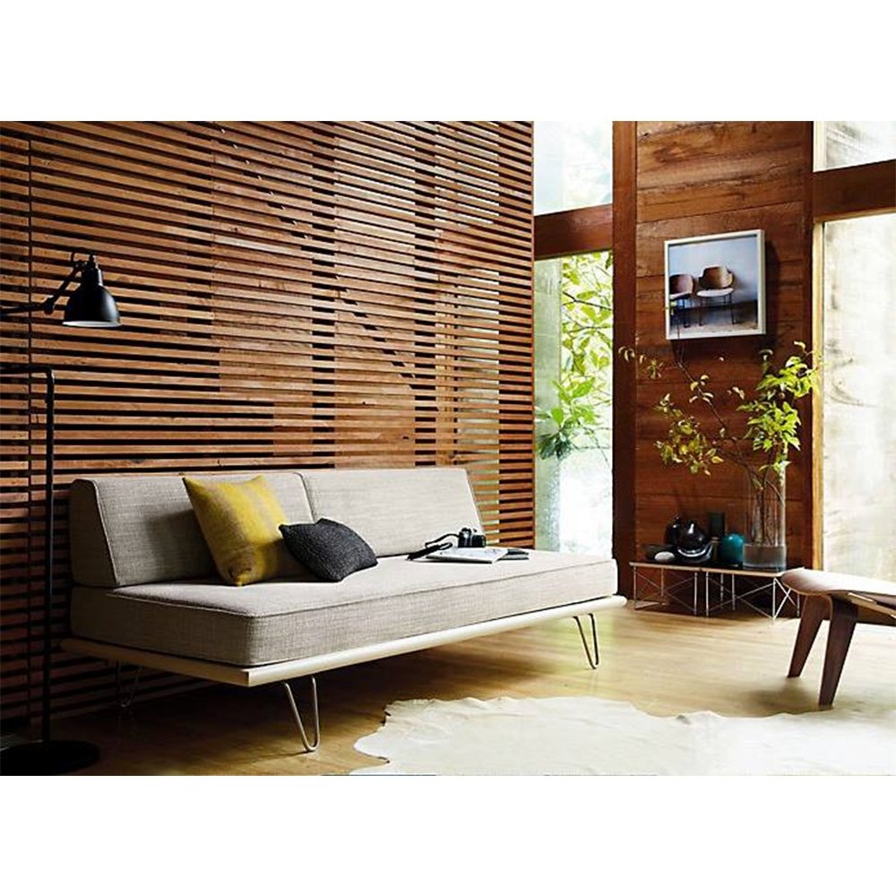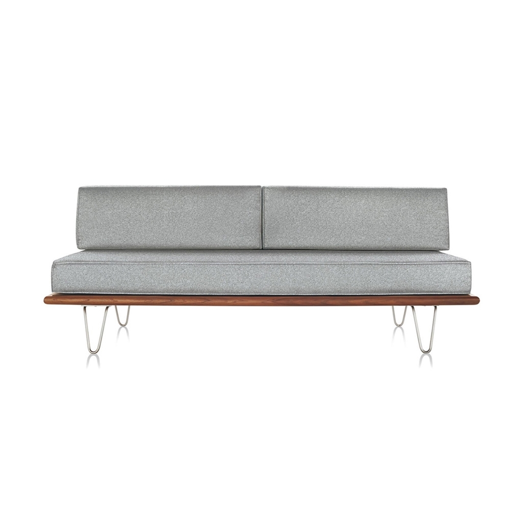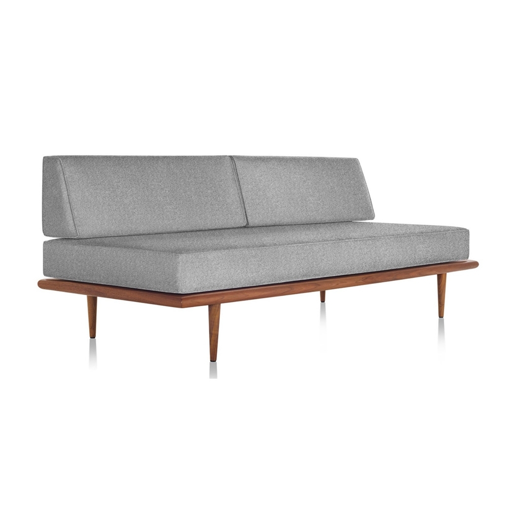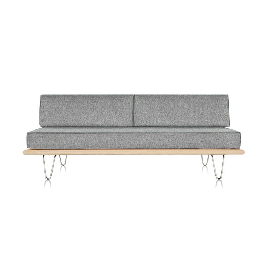 帶兩個枕墊的沙發床可選用胡桃木或白蠟木框架。 而支撐處既可以採用緞面鍍鉻的髮夾金屬椅腳,也可以採用胡桃木或白蠟木的木質系椅腳。 坐墊有五種材質及多種顏色供選擇。