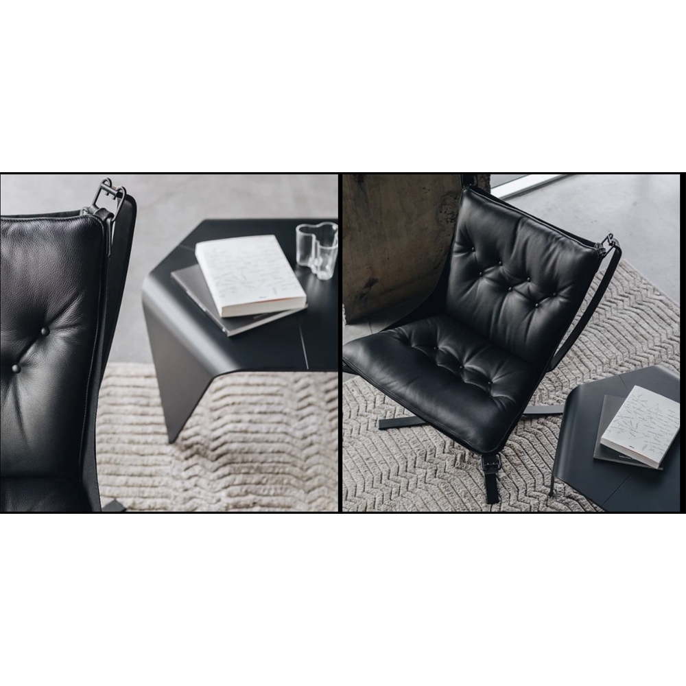 此件作品,椅背外型相似展翅於天空的獵鷹翅膀,以及椅背及底部支撐架的懸空式設計,使整體更為輕盈且具備極為舒適的感覺。