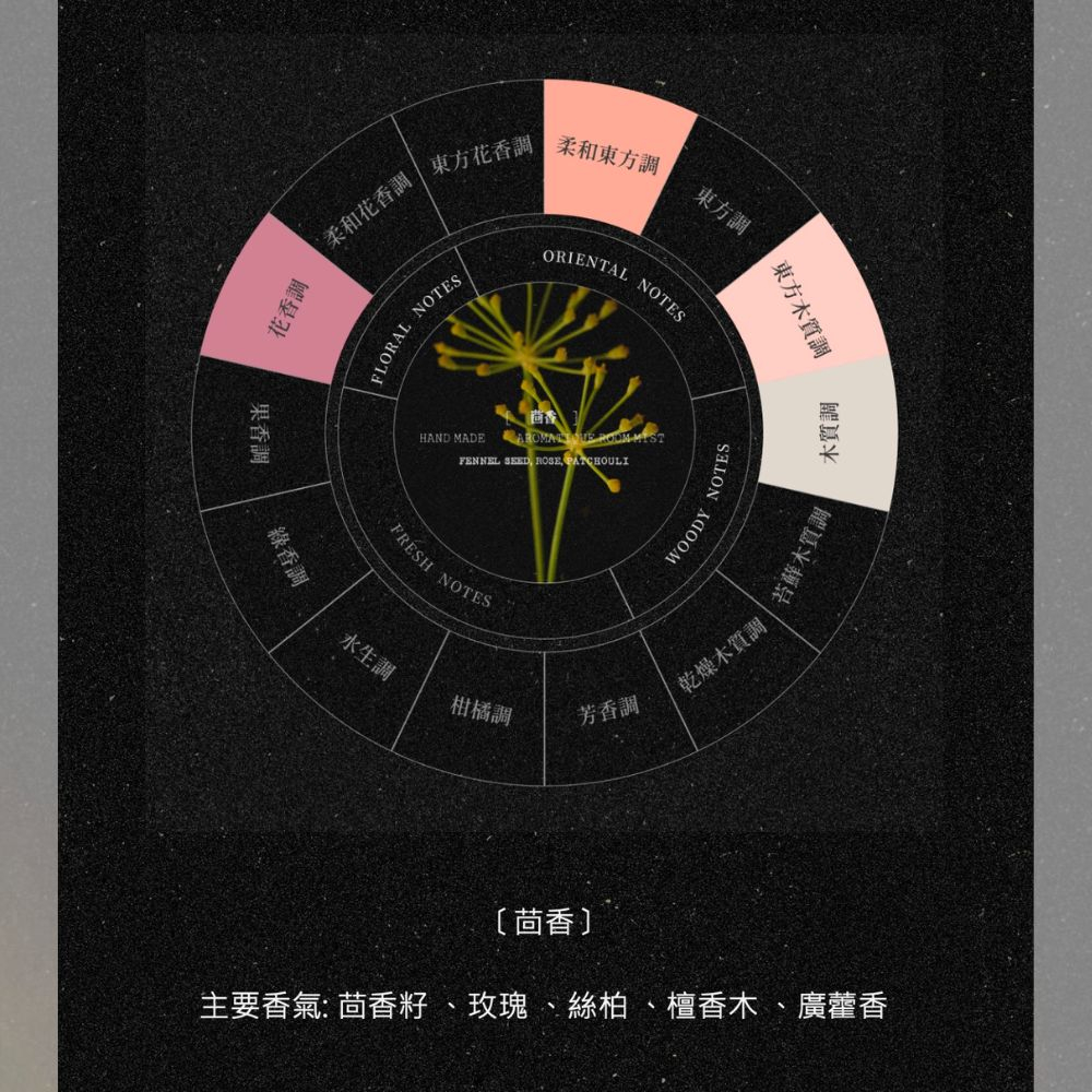 [茴香] 主香氣:茴香籽 、玫瑰 、絲柏 、檀香木 、廣藿香
