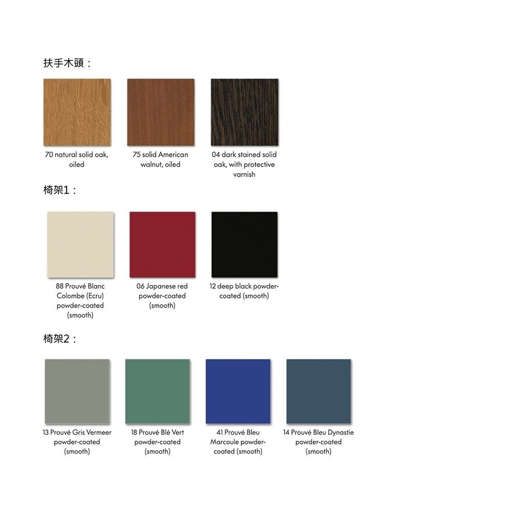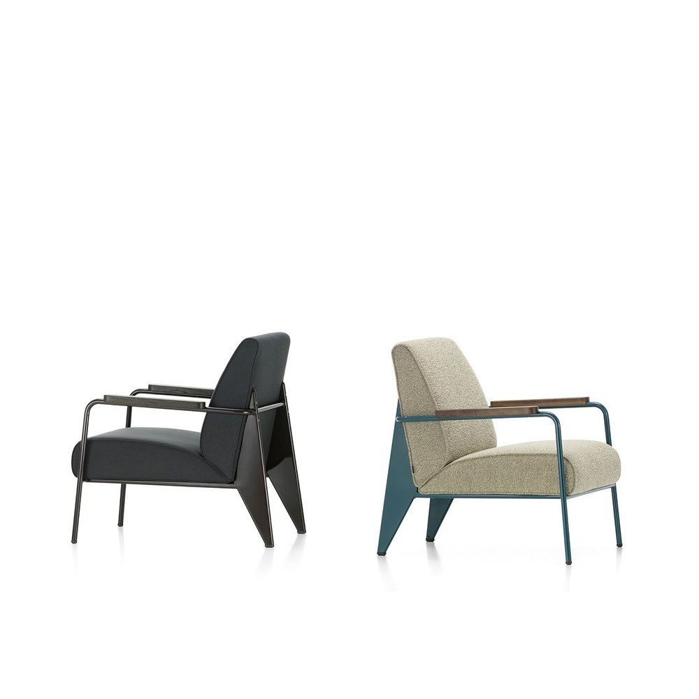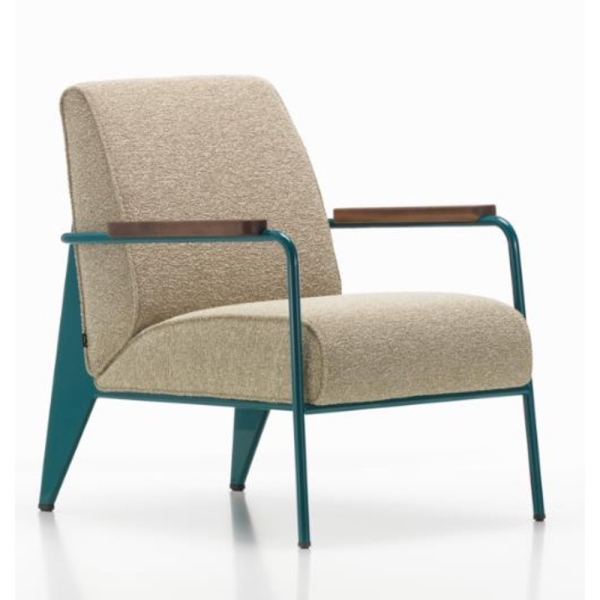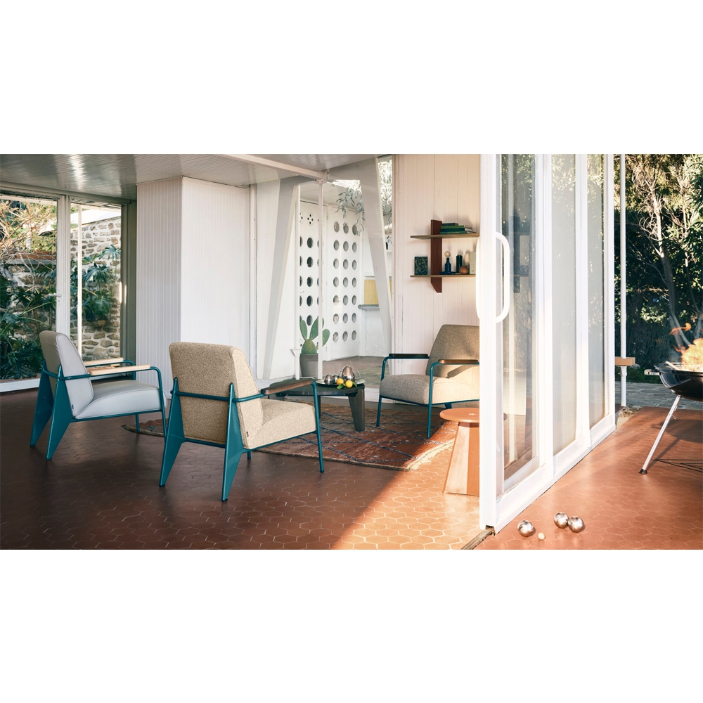Fauteuil de salon lounge chair 將平凡無奇的座椅提升至具有建築工法設計的舒適休閒椅。以設計鬼才 Jean Prouve 的原型設計,搭配摩登色澤強調現代感,扶手處的油裝實木更增添溫暖質感及易搭性,適合與任一件 Prouve 傢俱做搭配。本款座椅提供五色椅框以及多種布面材料可供選擇,扶手木把亦可選擇天然木質色、煙燻木質色、或榛果木質色。
