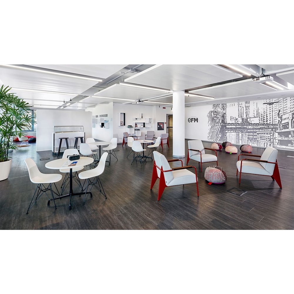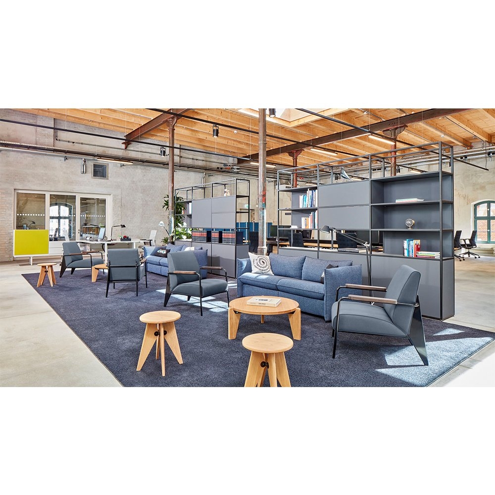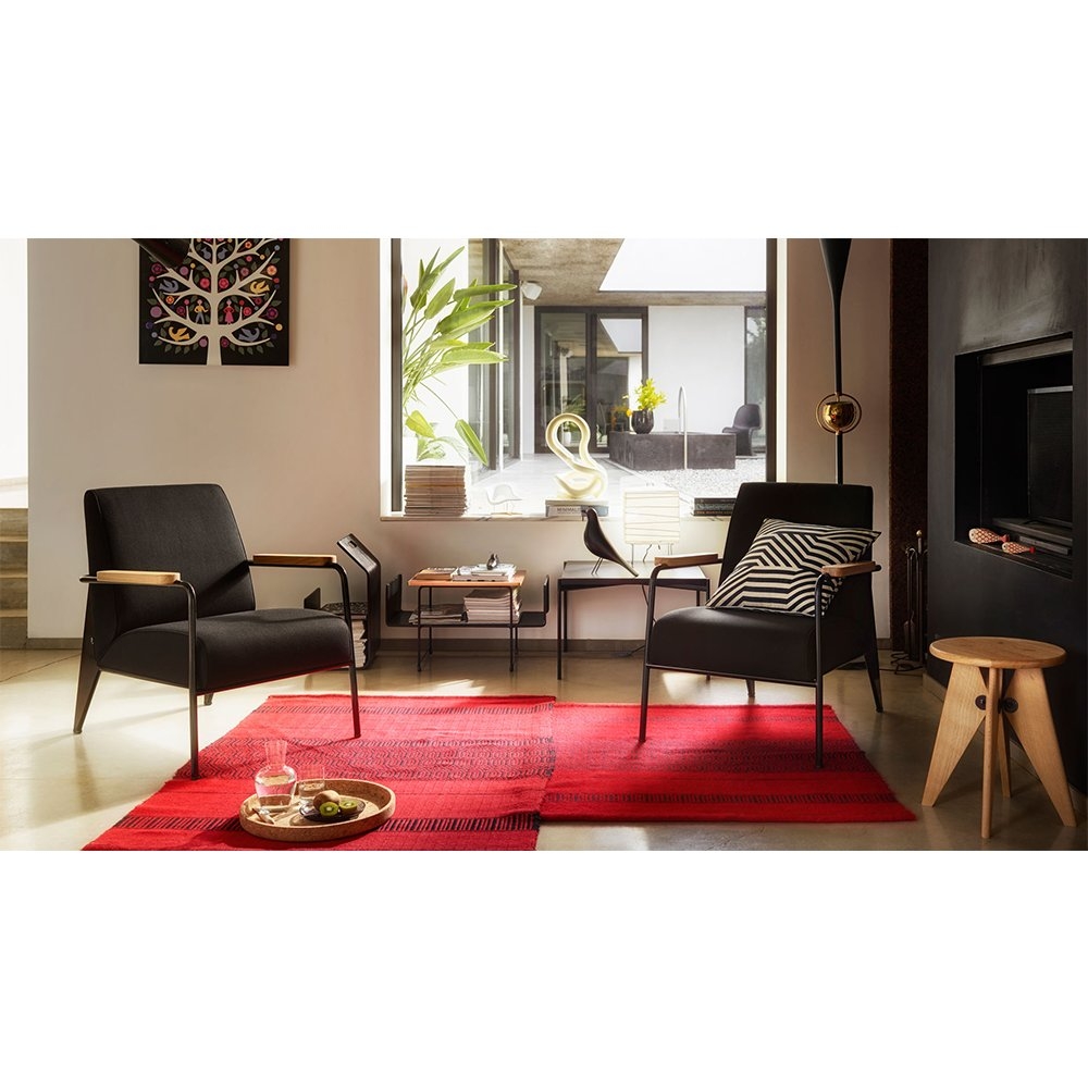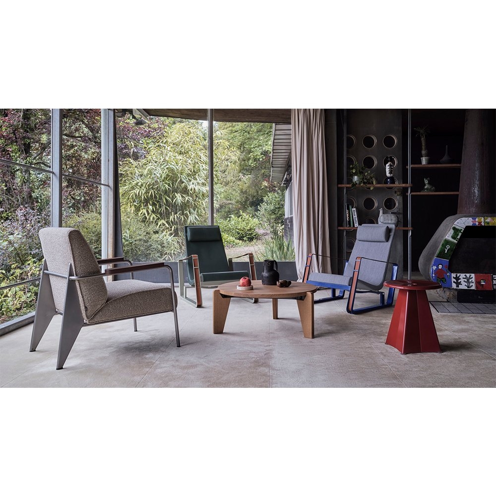 Fauteuil de salon lounge chair 將平凡無奇的座椅提升至具有建築工法設計的舒適休閒椅。以設計鬼才 Jean Prouve 的原型設計,搭配摩登色澤強調現代感,扶手處的油裝實木更增添溫暖質感及易搭性,適合與任一件 Prouve 傢俱做搭配。本款座椅提供五色椅框以及多種布面材料可供選擇,扶手木把亦可選擇天然木質色、煙燻木質色、或榛果木質色。