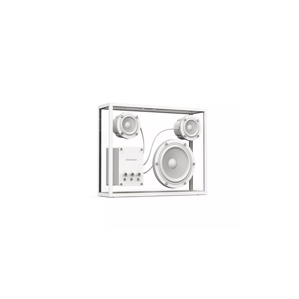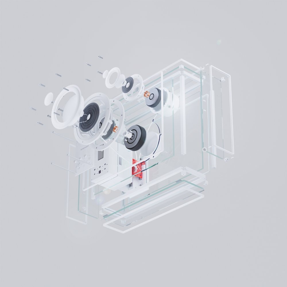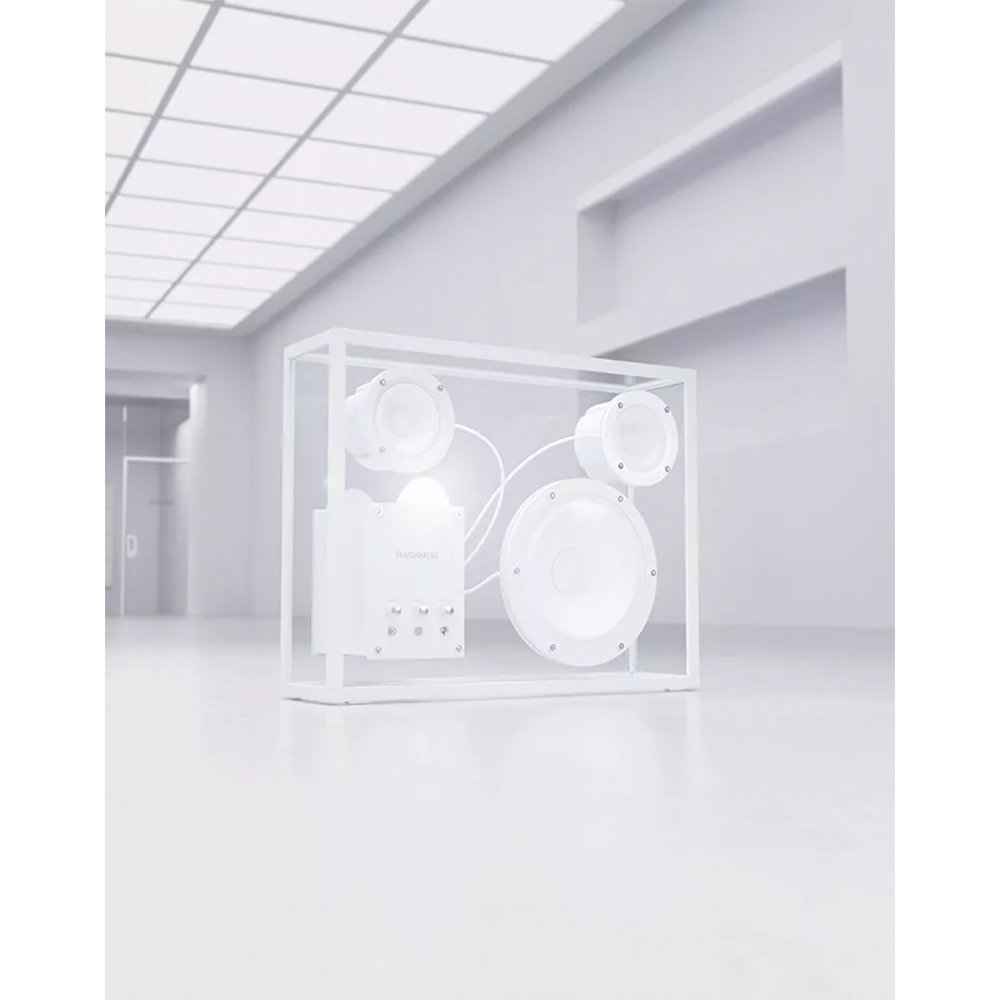 Transparent 透明音響白色以獨特的鋼化玻璃和鋁製單框結構呈現出透明一目瞭然的內部細節,展示一種源於對斯堪地那維亞簡約和功能主義熱愛的設計方法。