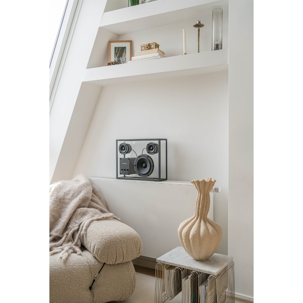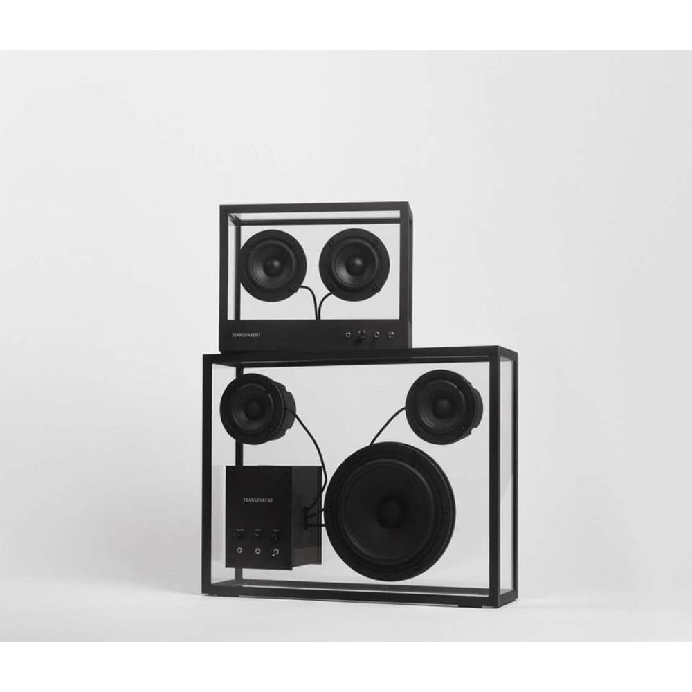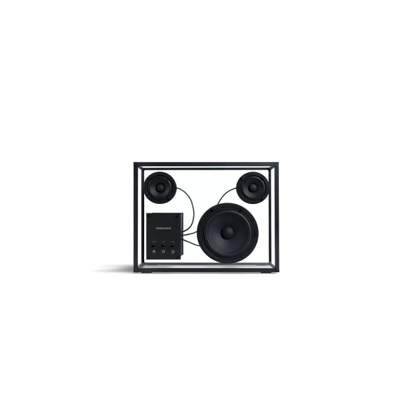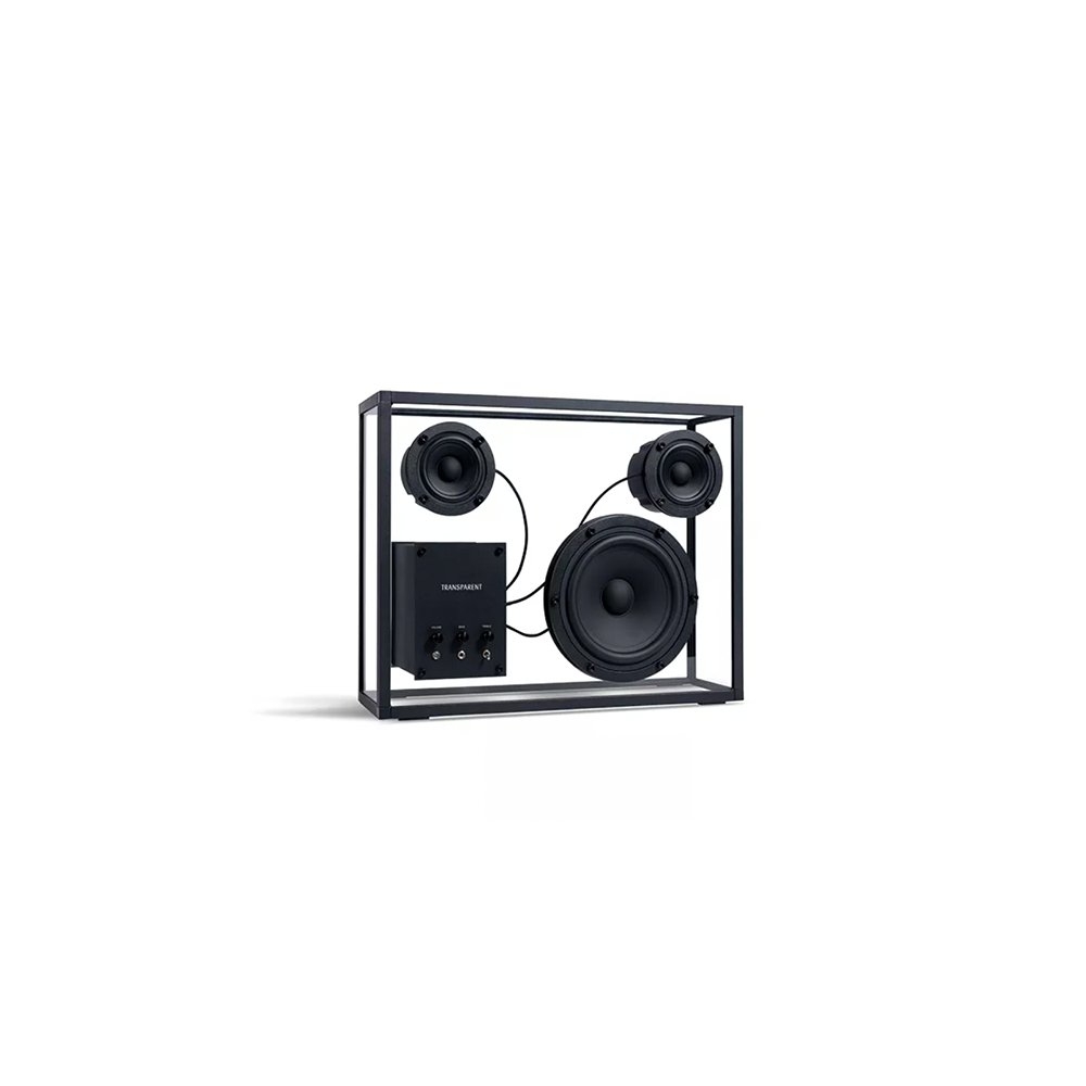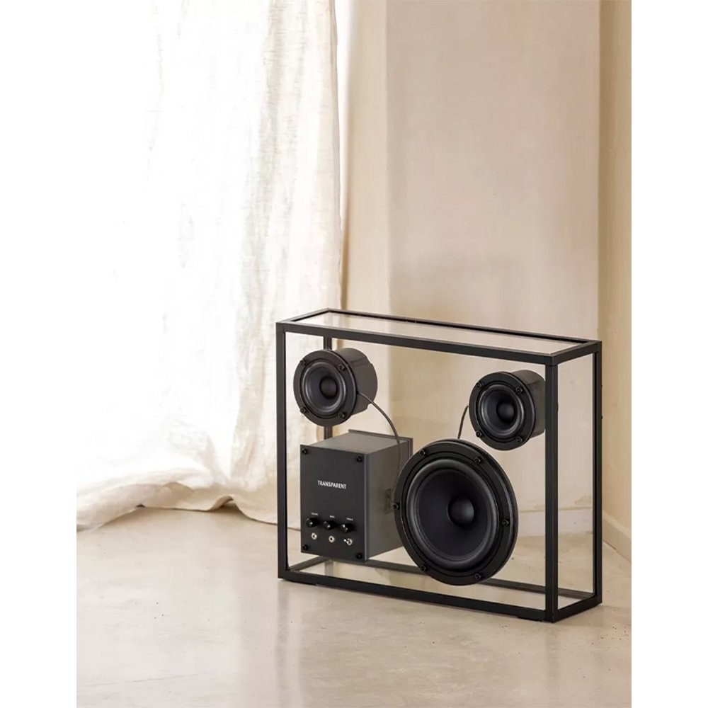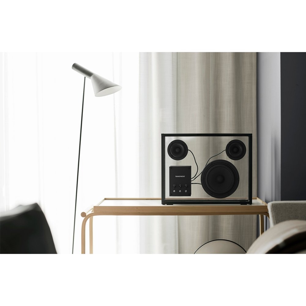 Transparent 透明音響黑色以獨特的鋼化玻璃和鋁製單框結構呈現出透明一目瞭然的內部細節,展示一種源於對斯堪地那維亞簡約和功能主義熱愛的設計方法。