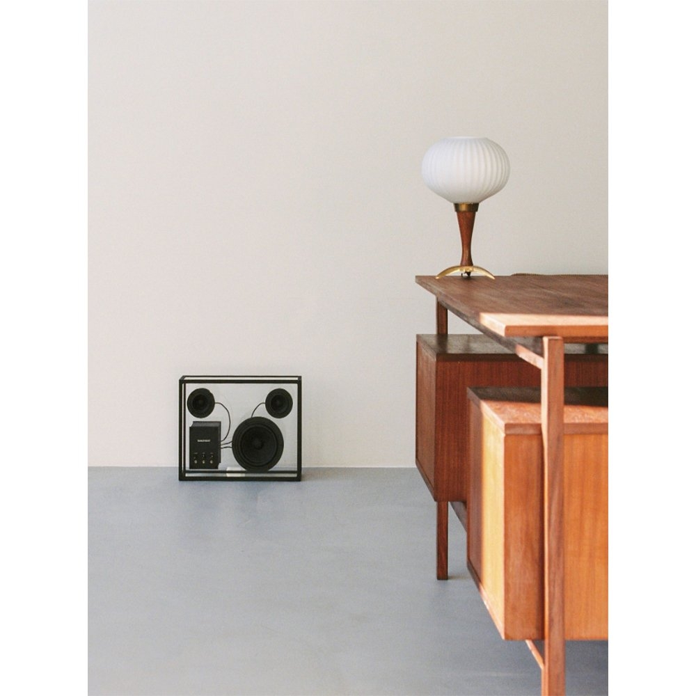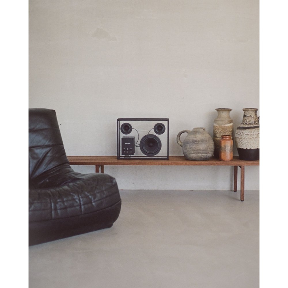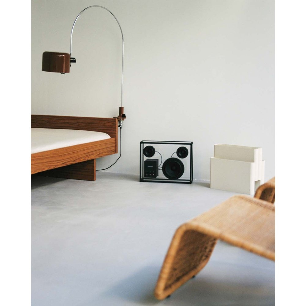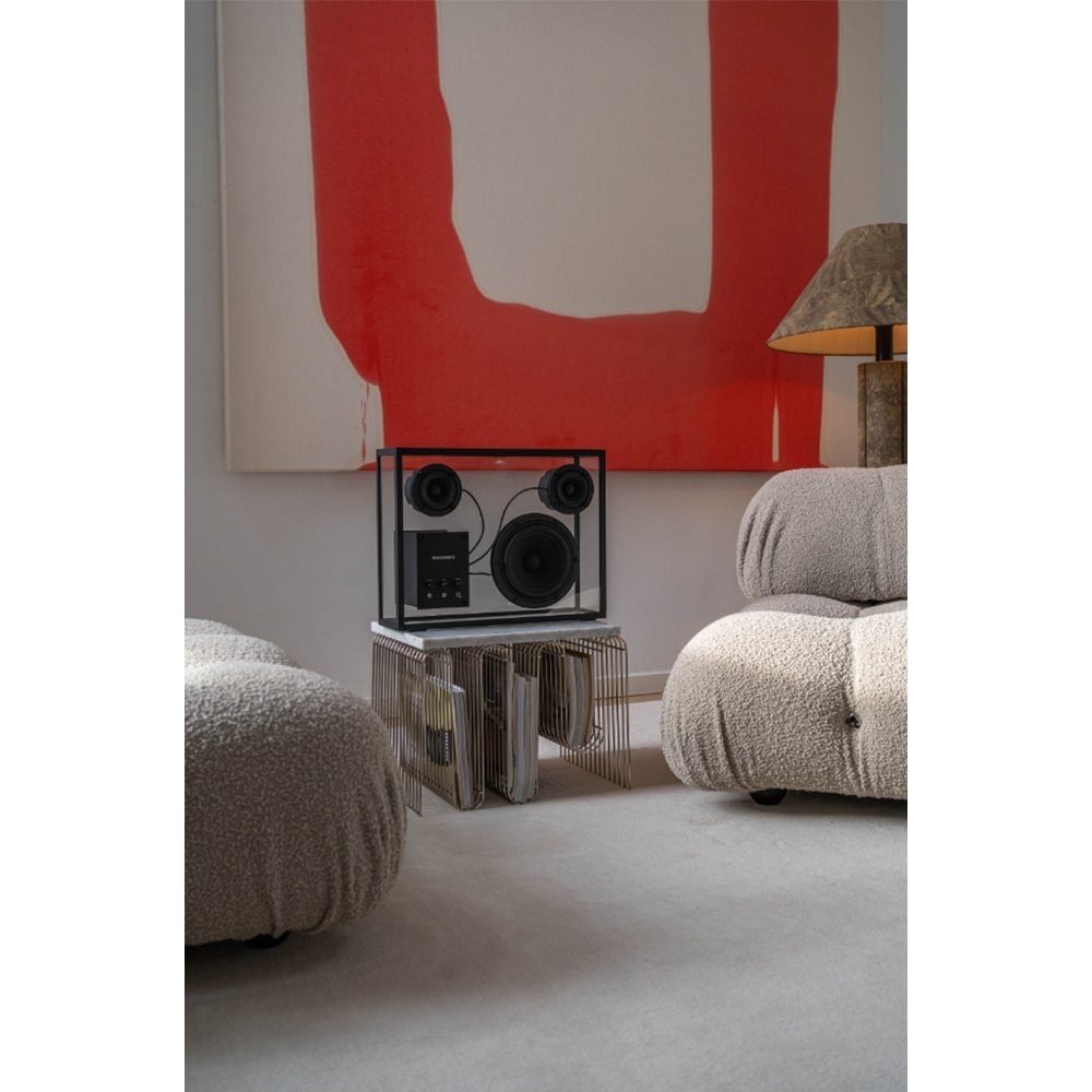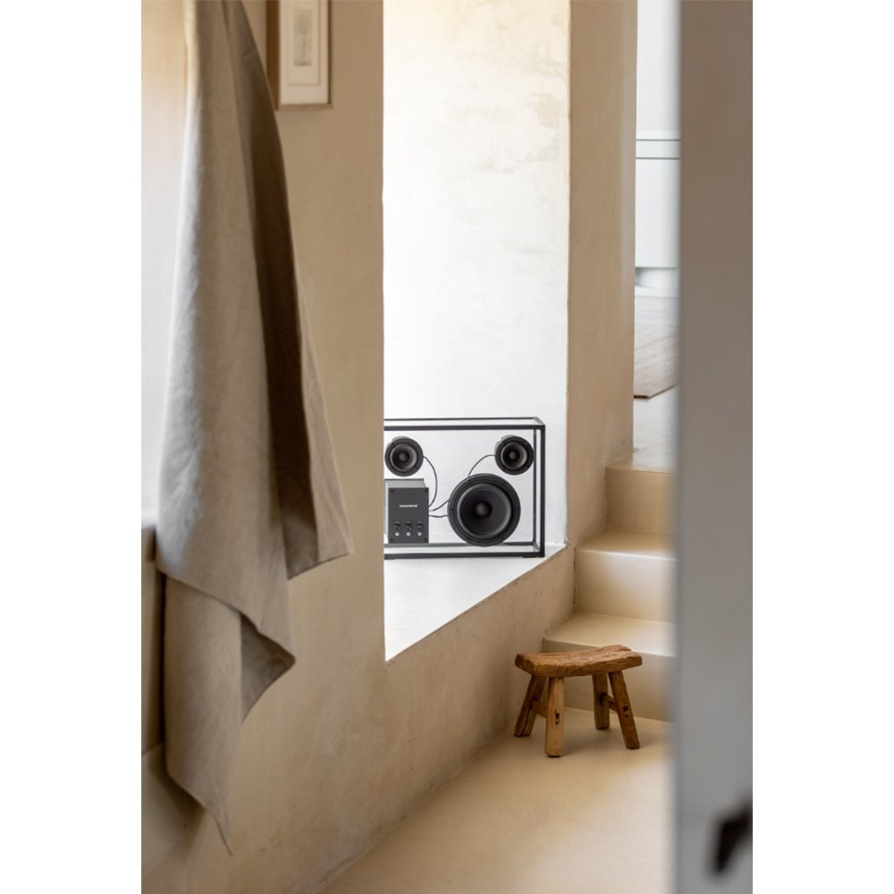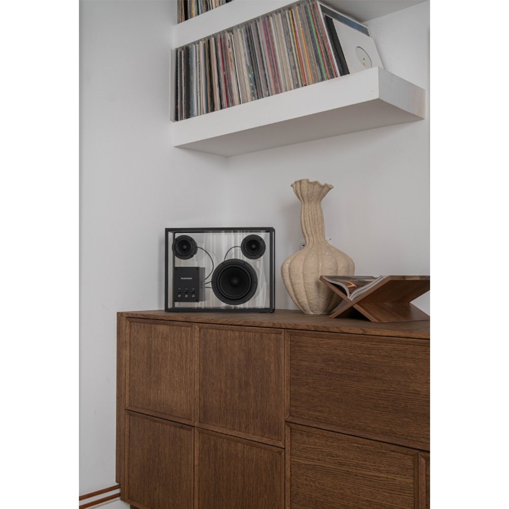 Transparent 透明音響黑色以獨特的鋼化玻璃和鋁製單框結構呈現出透明一目瞭然的內部細節,展示一種源於對斯堪地那維亞簡約和功能主義熱愛的設計方法。