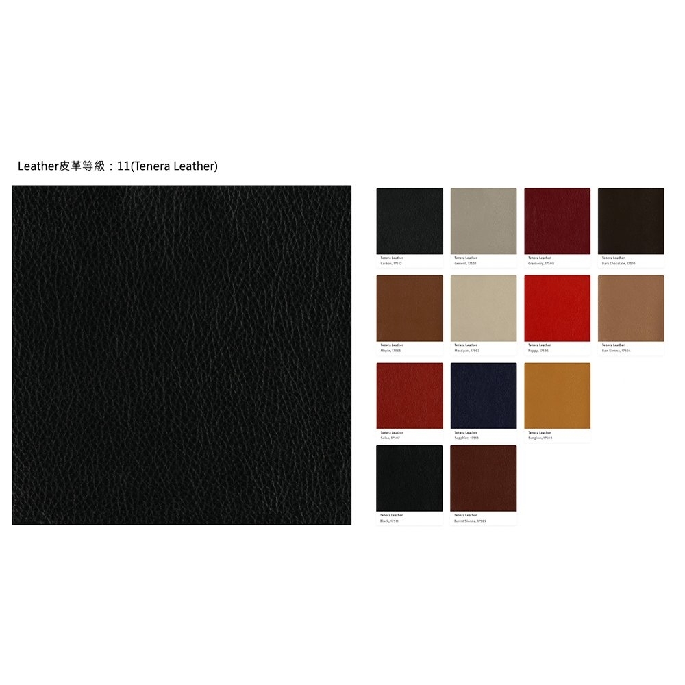 座墊材質:Leather Cat.9 (semi-aniline leather)、Leather Cat.10 (Bristol Leather)、Leather Cat.11 (Prone Leather)、Leather Cat.11(Tenera Leather)