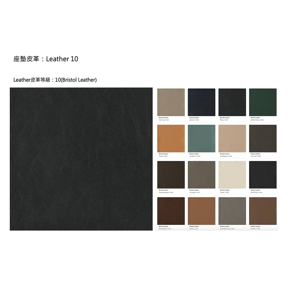 座墊材質:Leather Cat.9 (semi-aniline leather)、Leather Cat.10 (Bristol Leather)、Leather Cat.11 (Prone Leather)、Leather Cat.11(Tenera Leather)