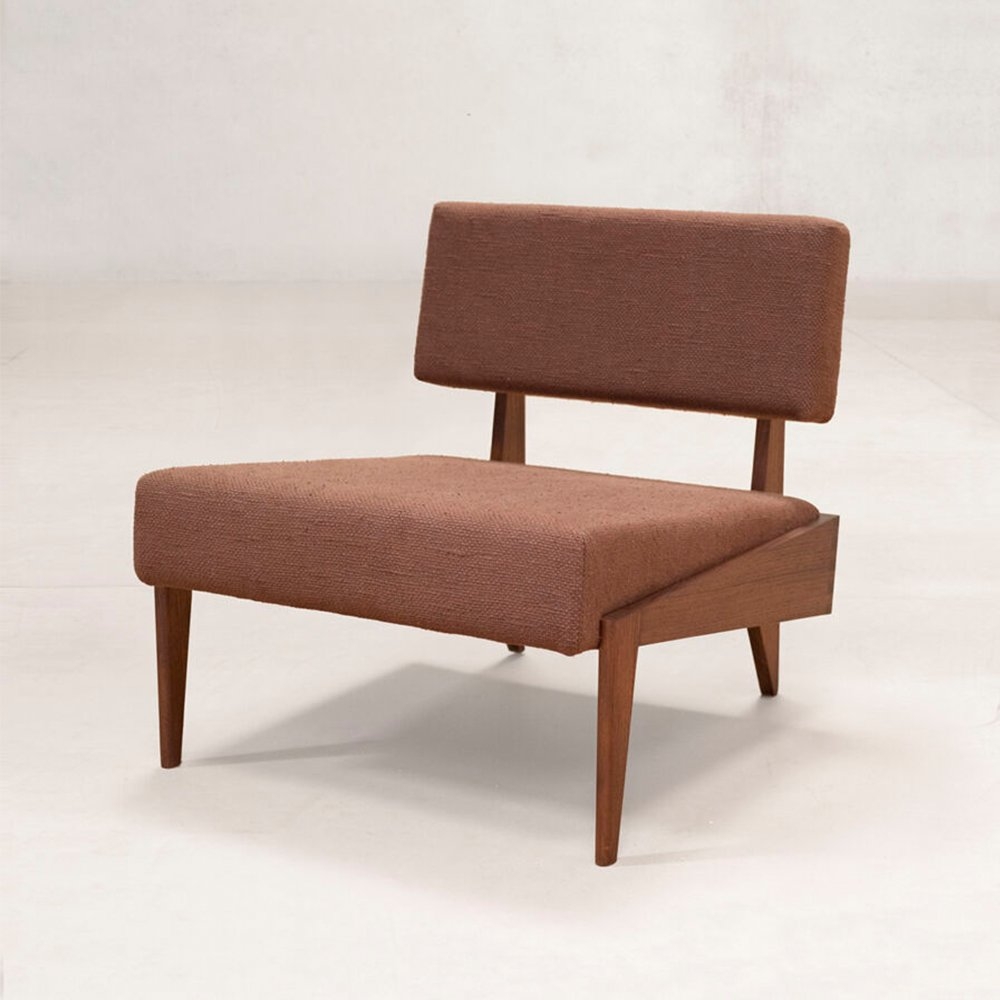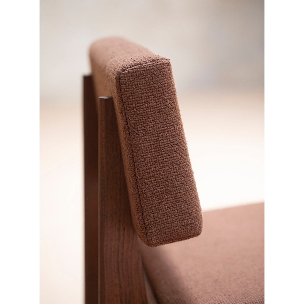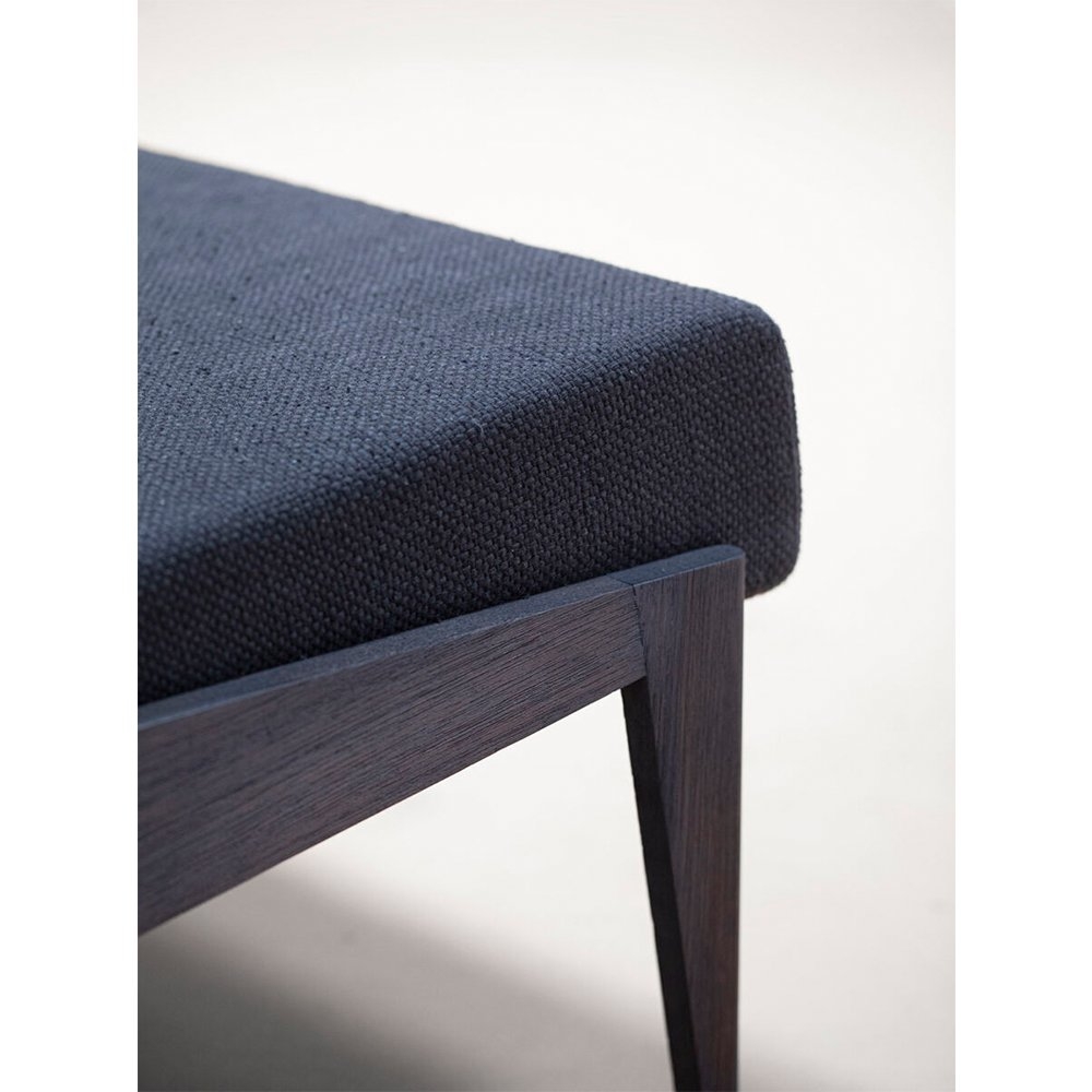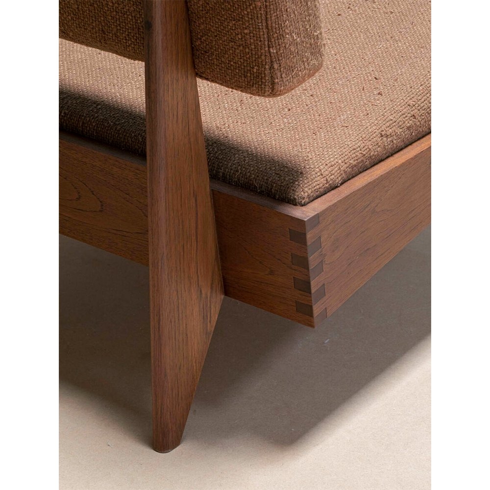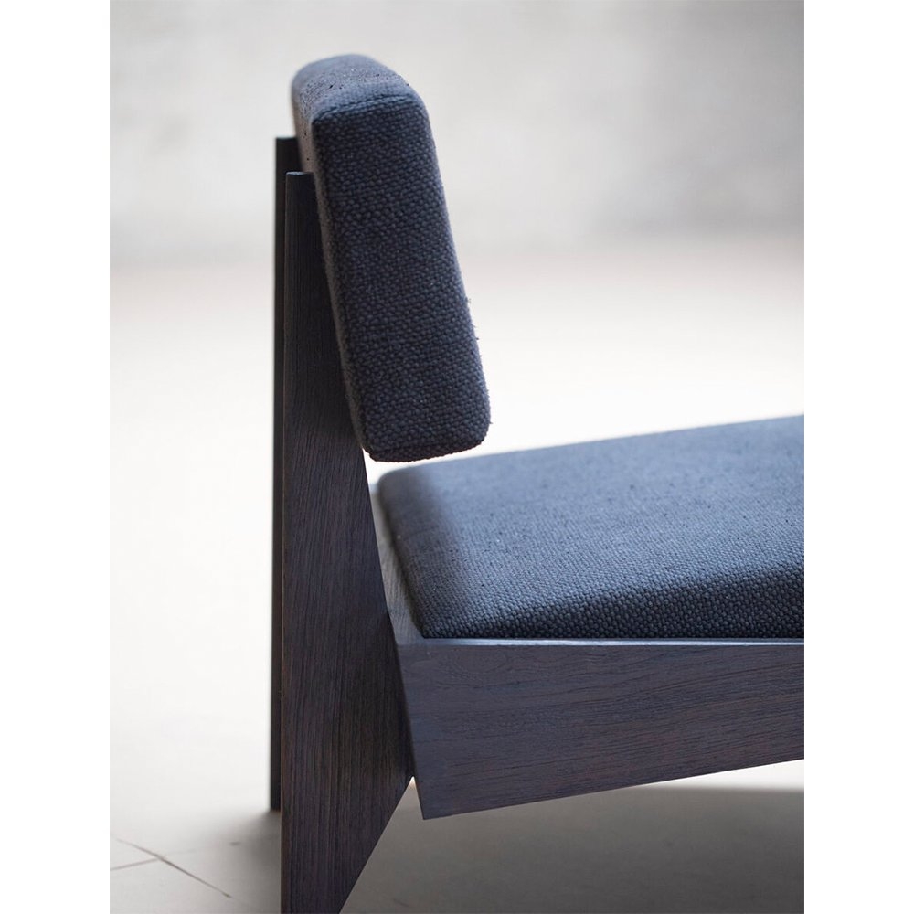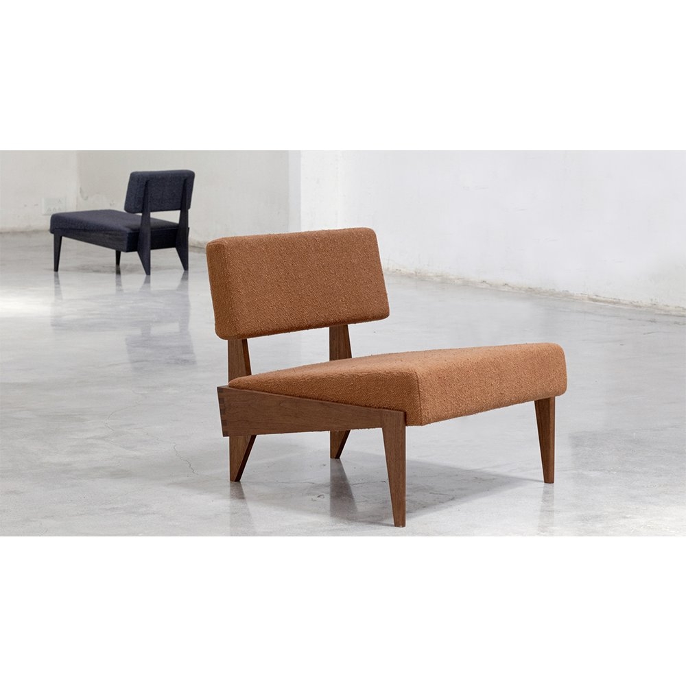 這款躺椅與經典的中世紀設計相呼應,採用傳統的木工細木工製成。室內裝飾布料是棉/絲混紡布料,稱為“Thasra”。這款椅子有兩種布料顏色和木質色調的組合可供選擇。兩種組合是夜空織物顏色(深藍色)+ 燒鈷椰殼木飾面或紅杉織物顏色(鐵鏽色)+ 深色柚木木飾面。 椅子所使用的布料是棉/絲混紡布料,由我們的布料合作商 Zanav Home 生產。它是由非常粗的開口棉紗與手紡絲紗合股而成,以彌補棉紗強度的不足。絲紗由桑蠶絲廢料製成,具有獨特的凹凸紋理。將紗線染色以獲得所需的顏色,並在其框架沉入地下的原始織布機上編織。這些坑式織布機非常適合編織像 Thasra 這樣的織物,因為地面可以吸收重型編織的張力,而這是傳統織布機不可能實現的。從紡紗到織造再到後整理的過程完全由手工完成,這轉化為織物的特性。顏色和紋理不一致是這種面料的特徵。